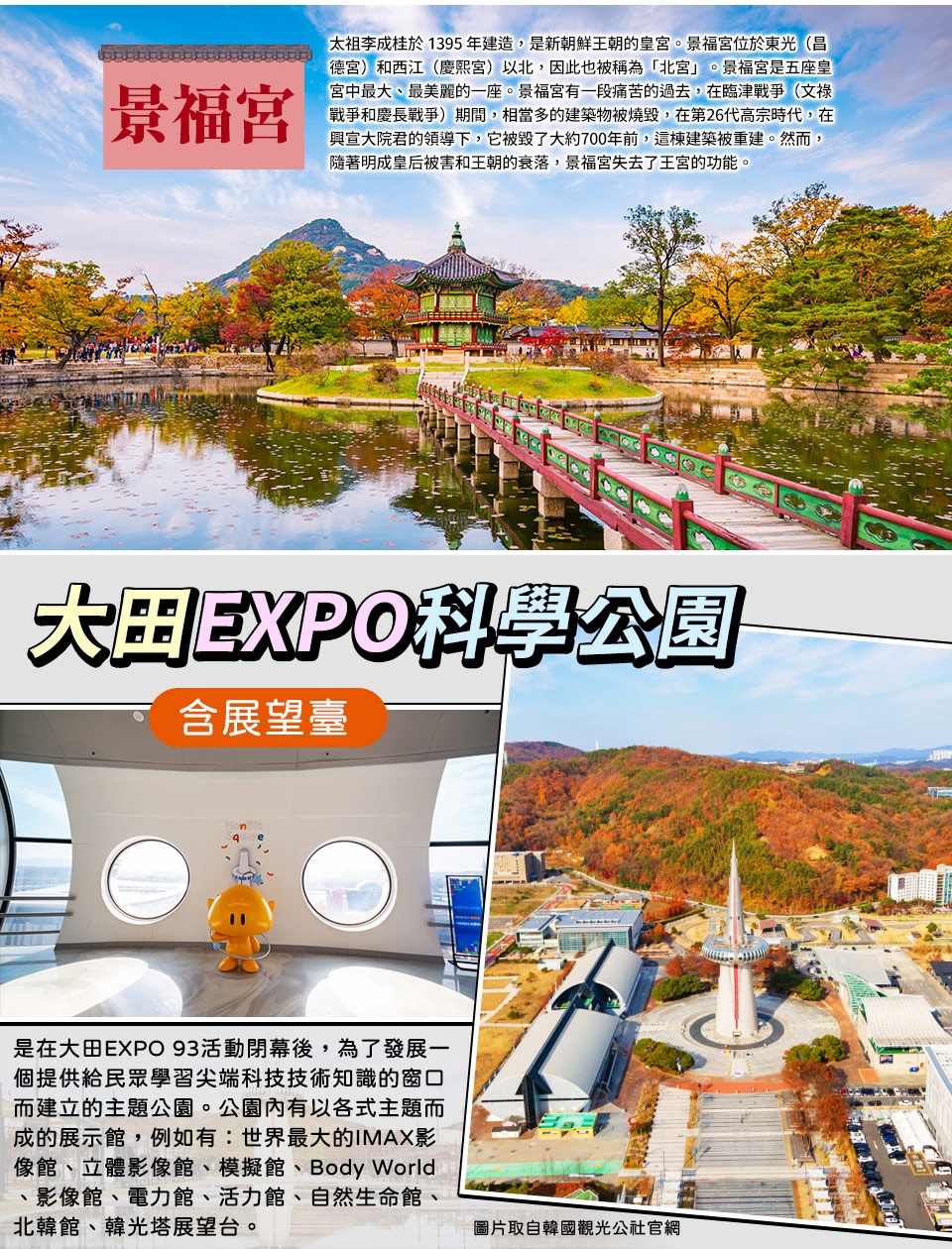 【EXPO科學公園】是在大田EXPO 93活動閉幕後,為了發展一個提供給民眾學習尖端科技技術知識的窗口而建立的主題公園。公園內有以各式主題而成的展示館,例如有:世界最大的IMAX影像館、立體影像館、模擬館、Body World、影像館、電力館、活力館、自然生命館、北韓館、韓光塔展望台,每個展示館中播放的影片資料也會持續更新。 早餐:內用早餐 午餐:【黑白大廚】白種元餐廳~香港飯店0401~海鮮辣湯麵或榨醬麵二選一+招牌糖醋肉 晚餐:金剛部隊鍋(白飯、拉麵無限供應) |