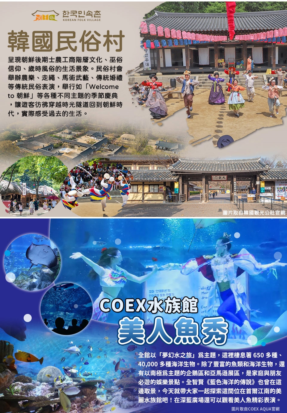 【首爾最大COEX水族館+美人魚秀】全館以「夢幻水之旅」為主題,這裡棲息著 650 多種、40,000 多種海洋生物。除了豐富的魚類和海洋生物,還有以南極為主題的企鵝區和亞馬遜展區,是家庭與朋友必遊的娛樂景點。全智賢《藍色海洋的傳說》也曾在這邊取景,今天就帶大家一起探索這間位在首爾江南的美麗水族館吧!在深藍廣場還可以觀看美人魚精彩表演。 早餐:內用早餐 午餐:馬鈴薯燉豬骨湯+道地小菜 晚餐:★米其林指南推薦★百年土種蔘雞湯 |