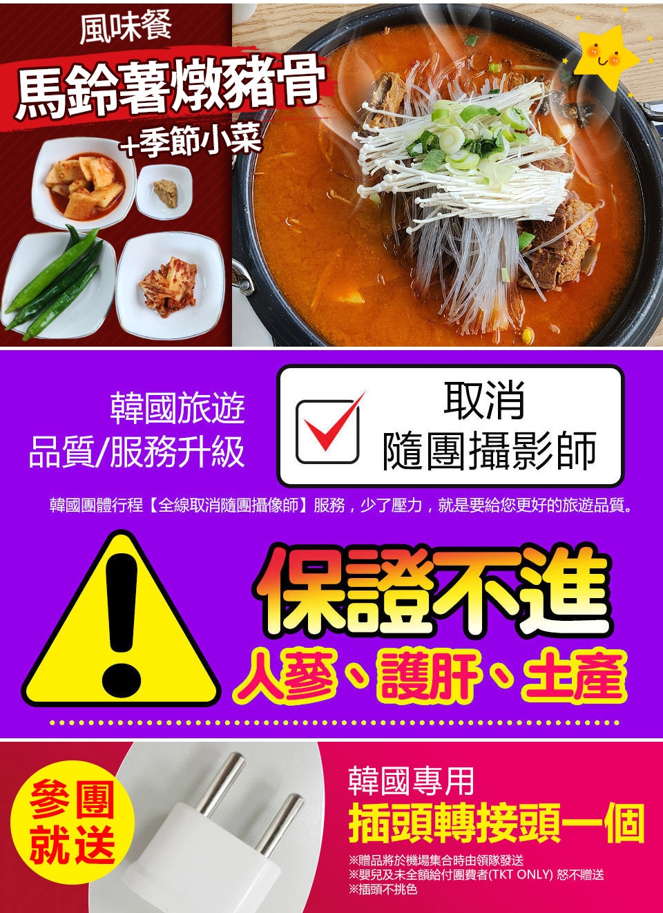 ※韓國飯店及渡假村因響應環保,請自行攜帶牙刷、牙膏、拖鞋、香皂、洗髮精及個人習慣性藥品。