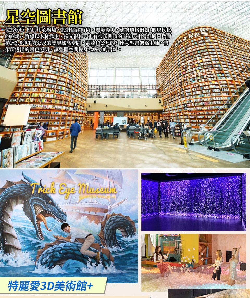 【第4天】 COEX水族館+美人魚秀─韓國IG爆紅打卡點~星空圖書館─COCONUT BOX─IG網紅打卡咖啡廳(贈送咖啡或果汁一杯)─特麗愛3D美術館─弘大鬧區 |