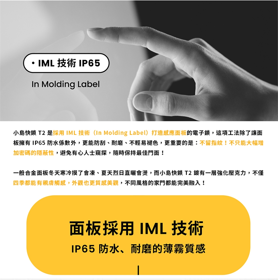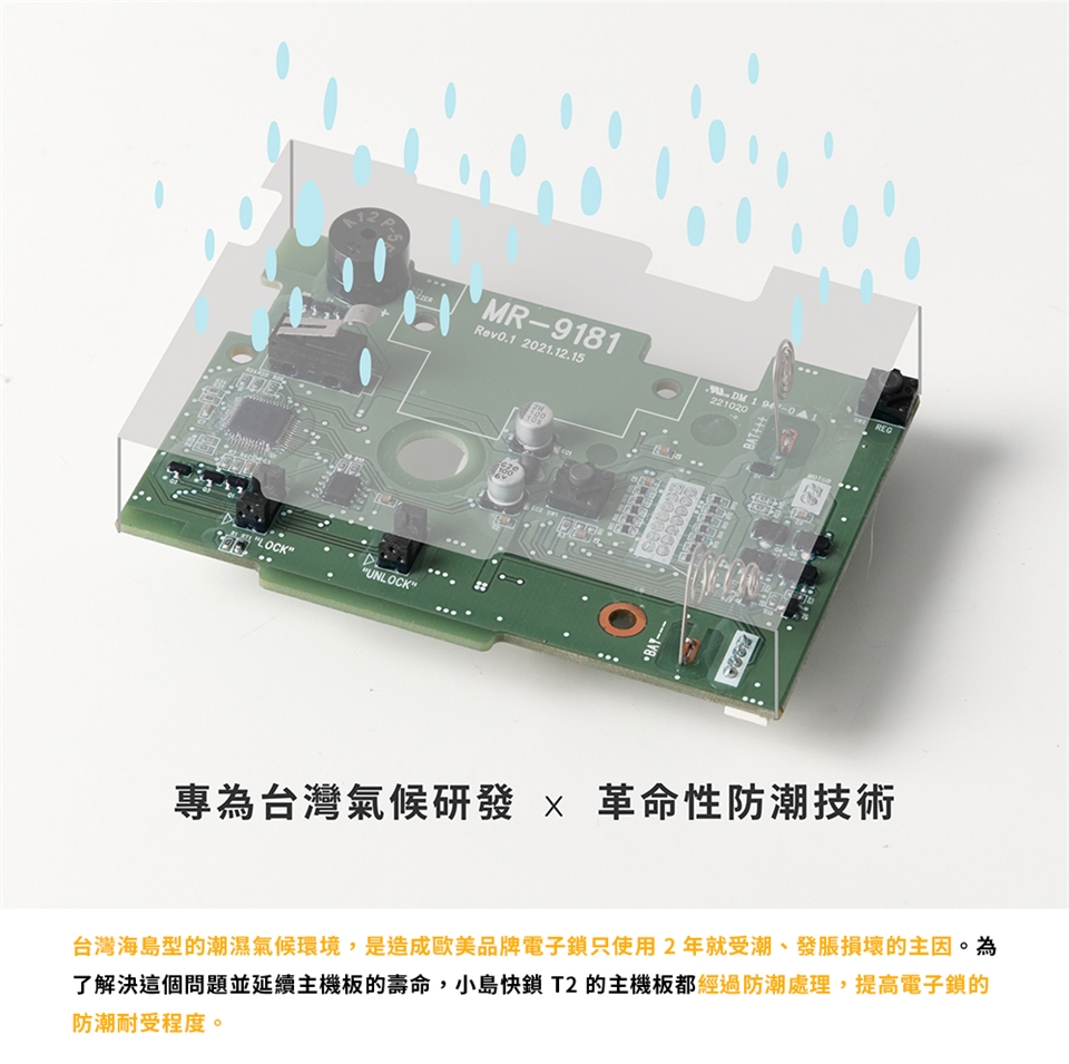◆IP65 防水係數,經過兩道防潮處理,提高電子鎖 200 % 的防潮耐受程度。