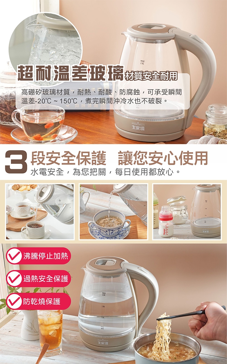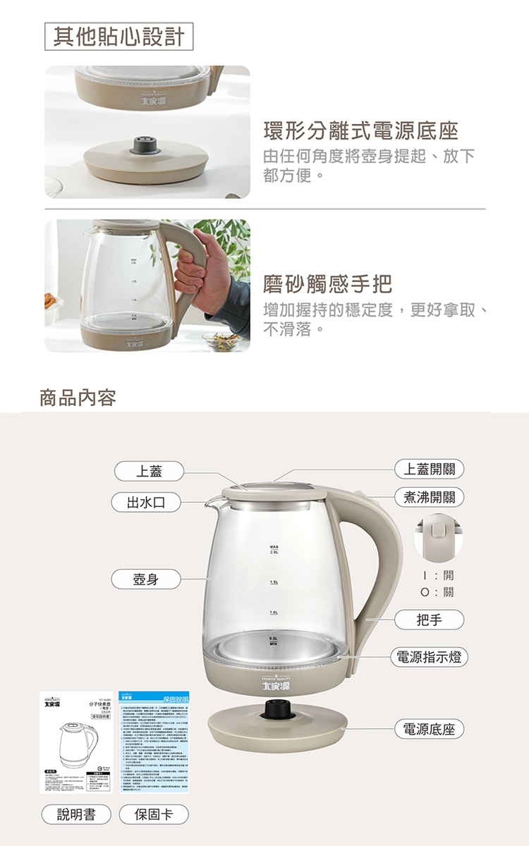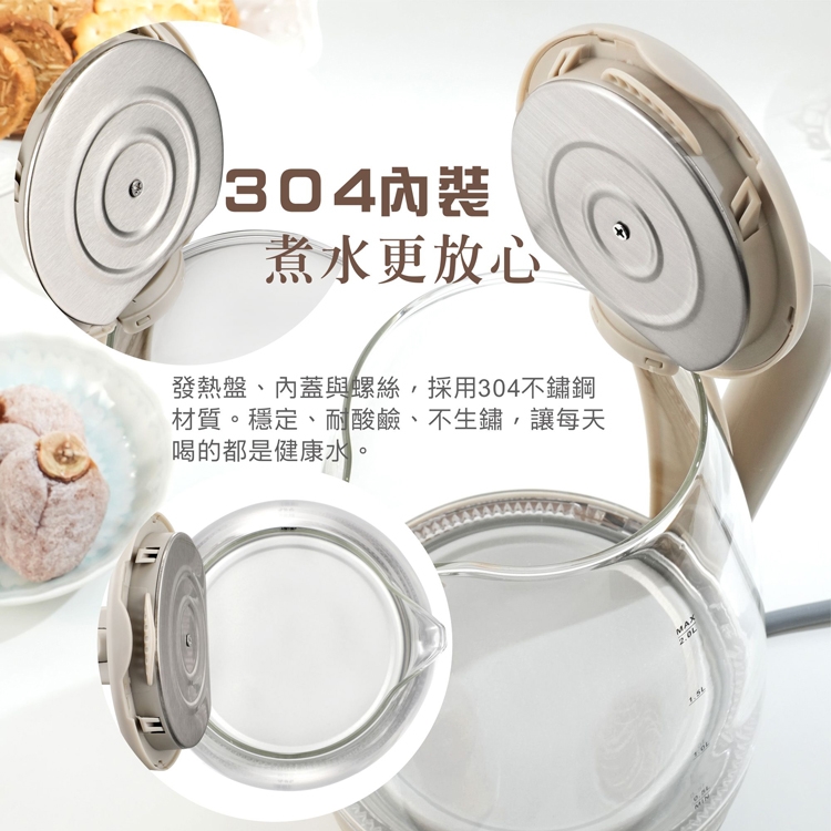 商品材質:內蓋、內蓋螺絲、加熱盤-304不鏽鋼;壺蓋、把手、壺身底座、電源底座-PP;壺身-高硼矽玻璃