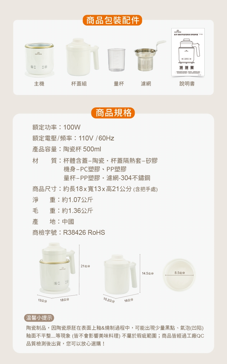 內 容 物:主機x1、陶瓷杯蓋(含矽膠隔熱套)x2、不鏽鋼濾網x1、塑膠量杯x1、產品使用說明書(內含保固卡)x1