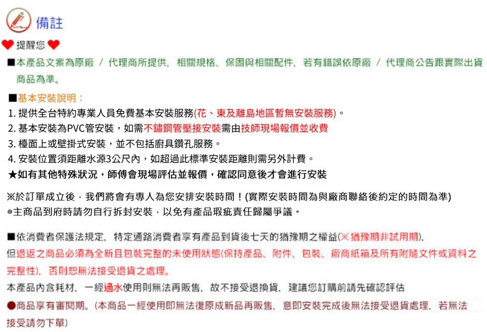 本產品內含耗材,一經安裝過水使用則無法再販售,故不接受退換貨,建議您訂購前請先確認評估