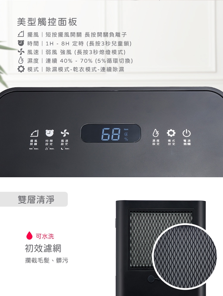 額定除濕能力: 12 公升/ 日 (室溫27 ℃;濕度 60 %)
