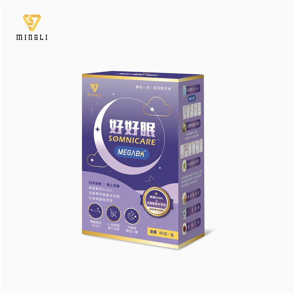 成 分:L-色胺酸、微結晶狀α-纖維素、米糠胚芽發酵萃取粉(糊精、米糠胚芽發酵萃取物(含GABA))、蘆筍萃取粉(蘆筍萃取物、糊精)、龍眼花萃取粉(龍眼花萃取粉、糊精)、酸棗仁粉、啤酒酵母粉。