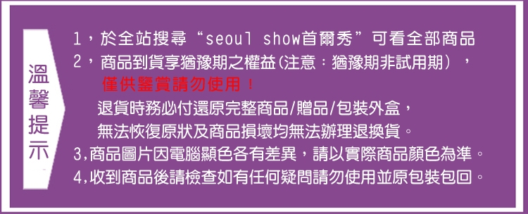 退貨時務必附還原完整商品、贈品、包裝外盒均齊全無法恢復原狀及商品損壞等均恕無法辦理退換貨。