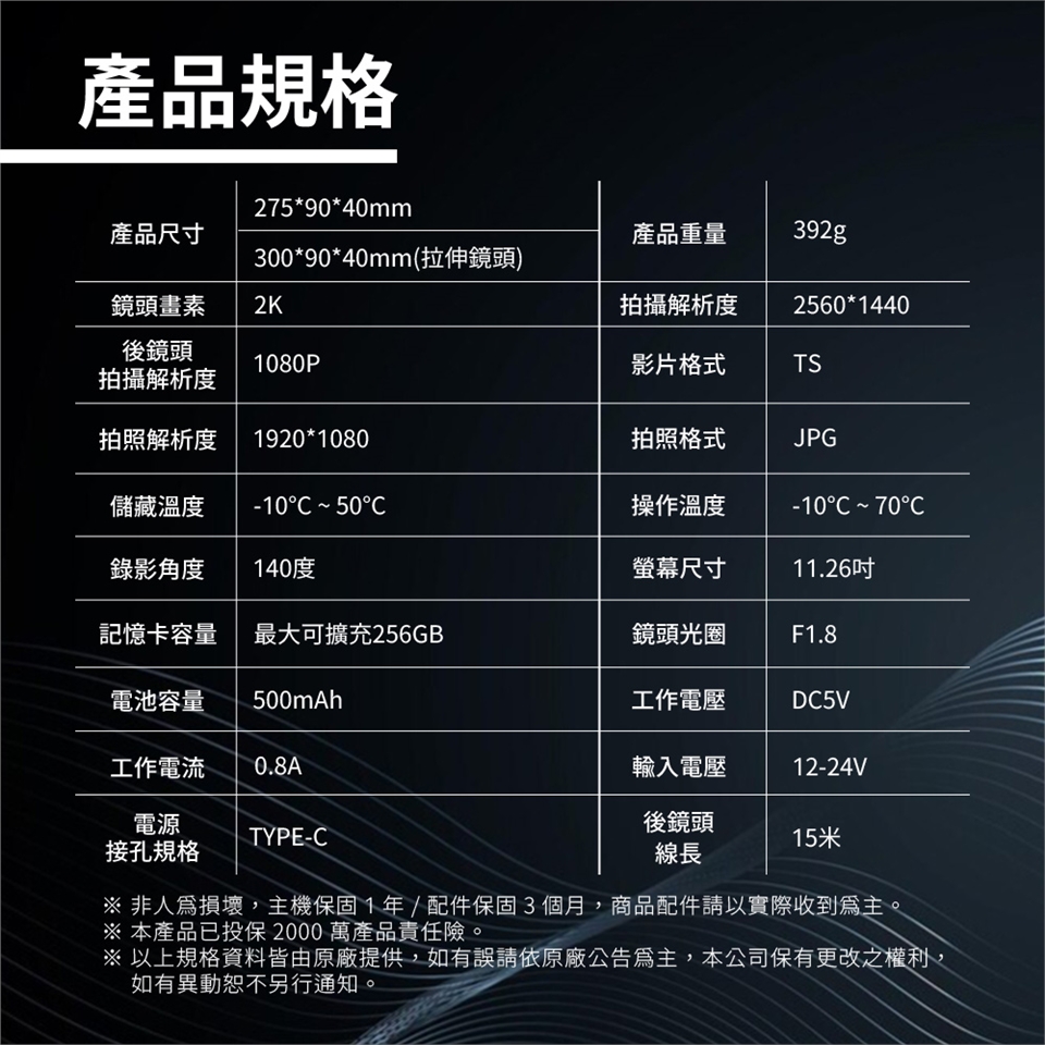 配件:主機/後鏡頭/15m後鏡頭延長線/車內鏡頭/GPS接收器/GPS更新線/3.5m車充/Type-C線/橡皮綁帶/說明書(保卡)