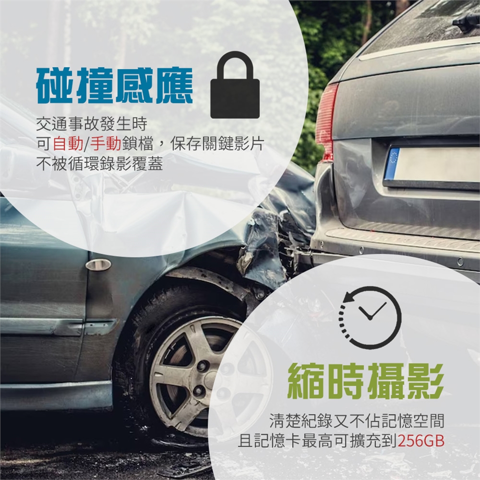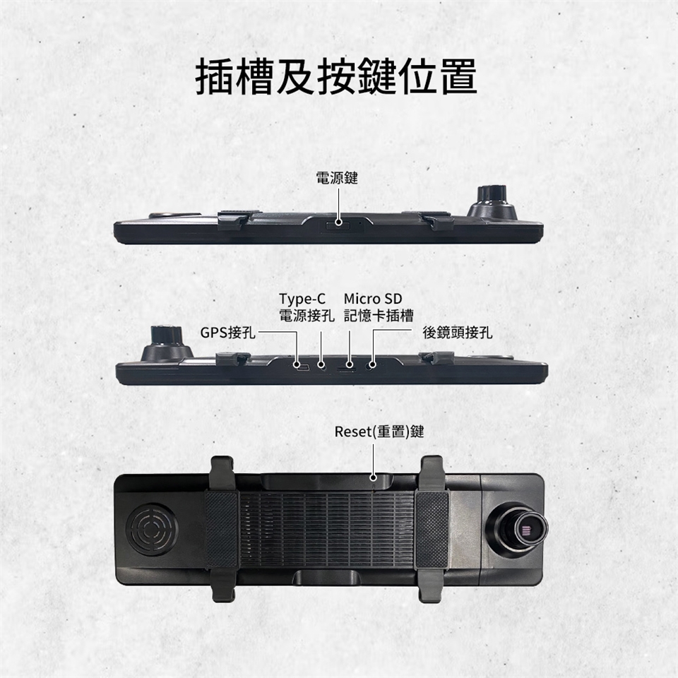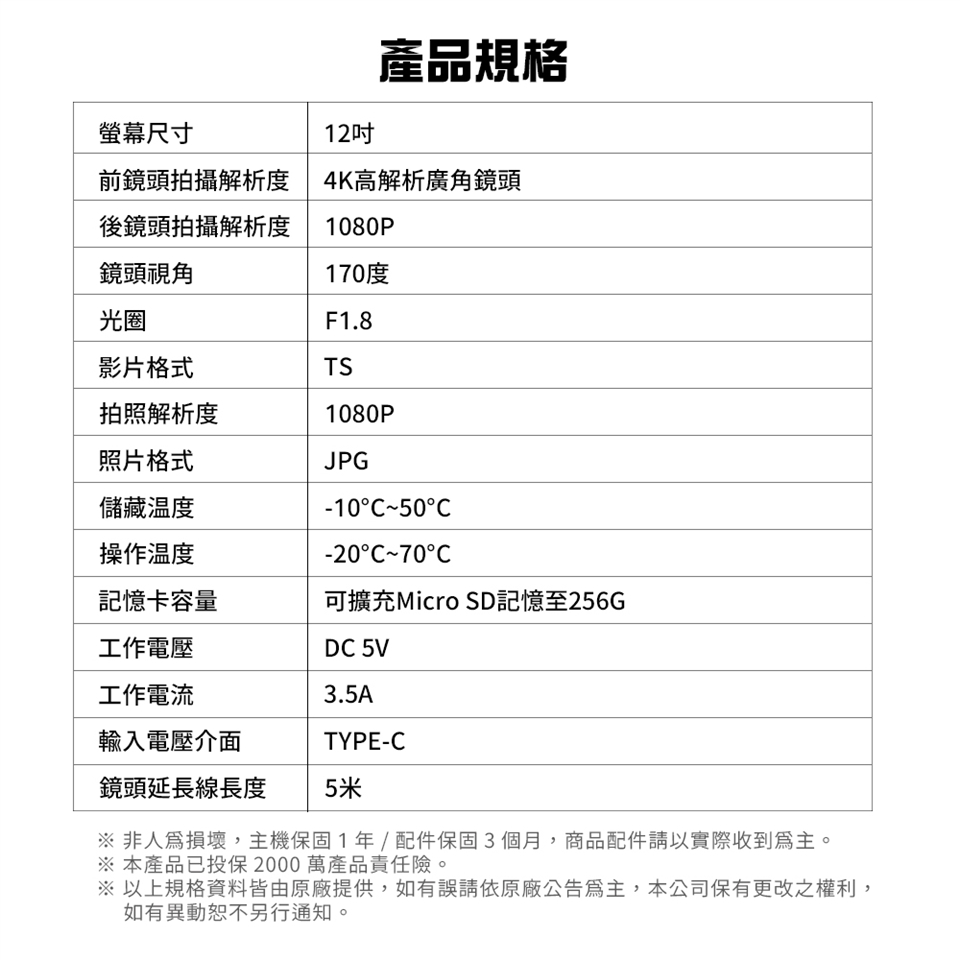 配件:主機/固定橡皮*2/1080P後鏡頭/GPS接收器/GPS更新線/5m後鏡頭延長線/3.5m車充/TypeC USB線/保卡/說明書