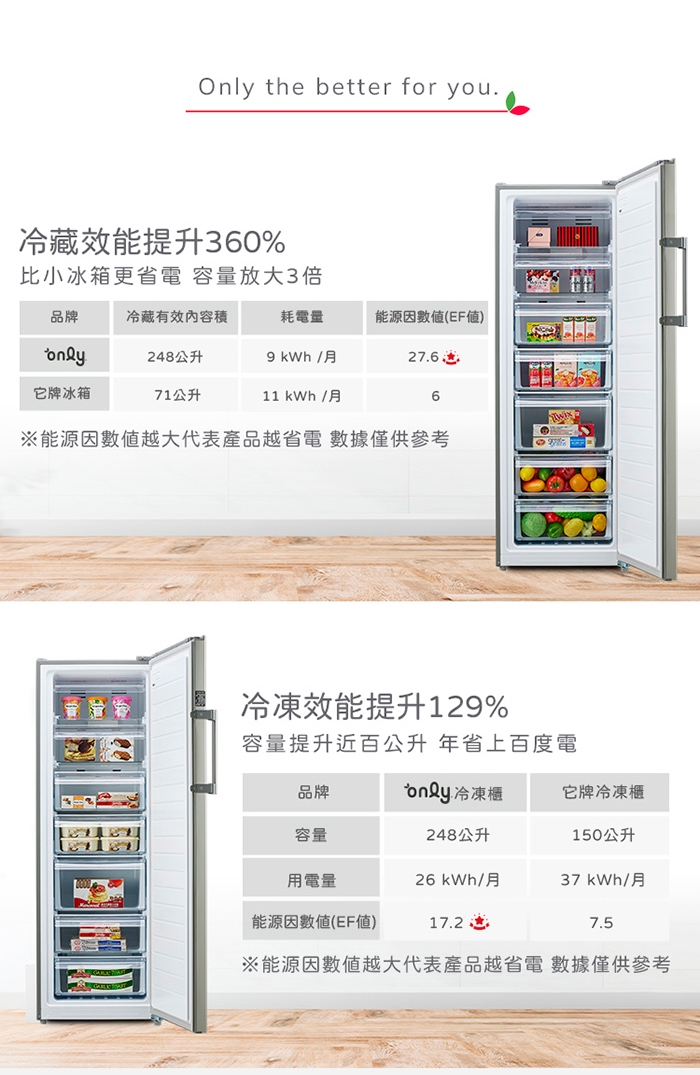 能源因數值(EF值): 冷藏 27.6ℓ/kWh/月 冷凍 17.2ℓ/kWh/月