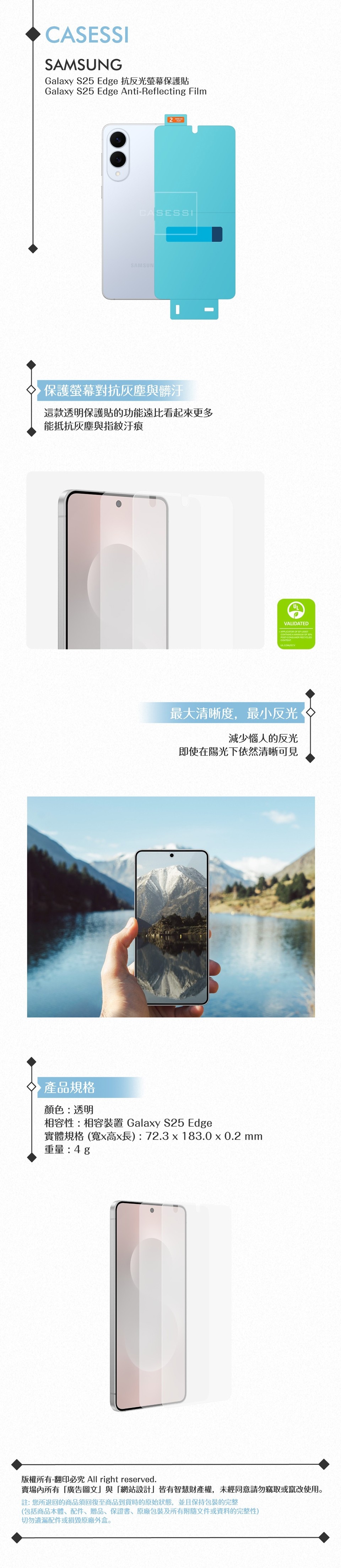 商品名稱:Galaxy S25 Edge 抗反光螢幕保護貼