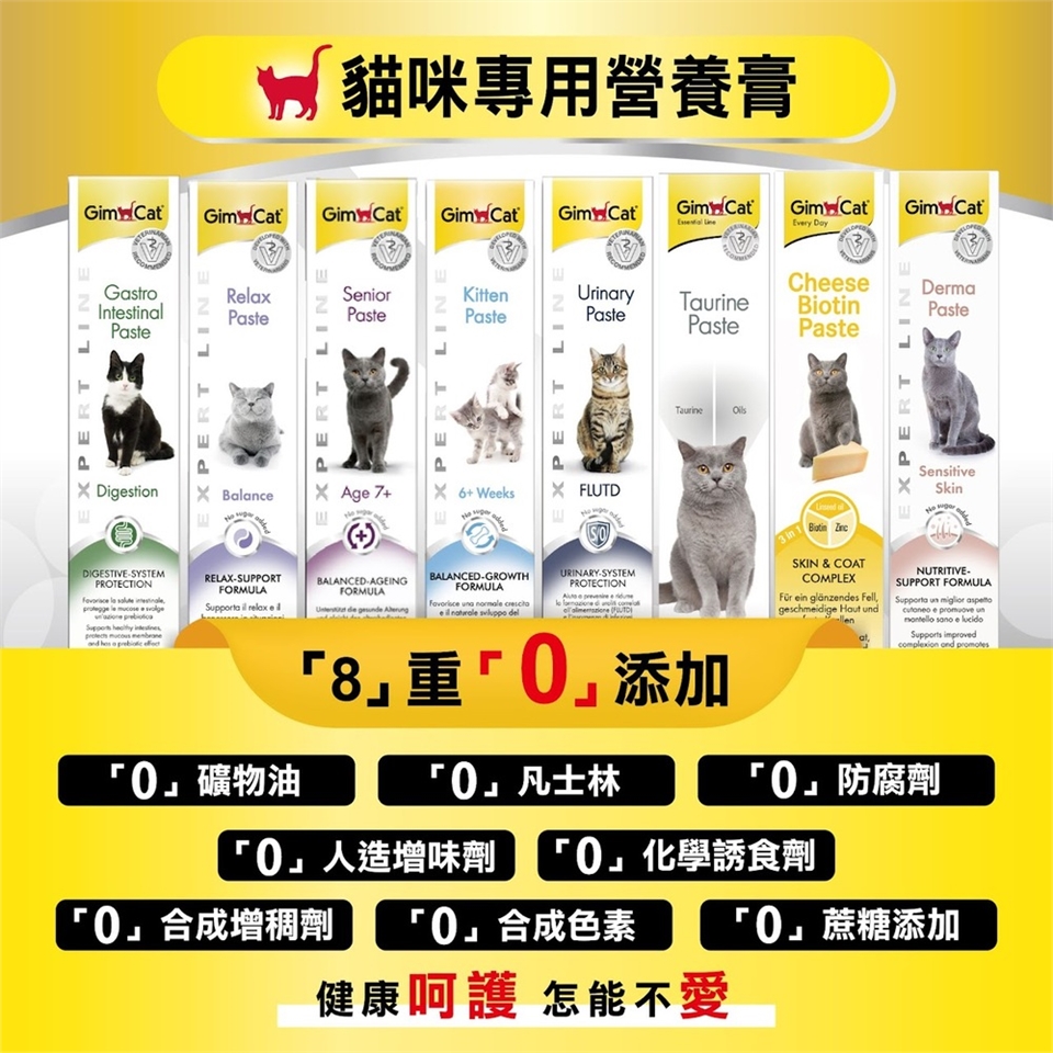 GimCat起司營養含有3合1功能:生物素、鋅和亞麻籽油的組合,具有皮膚和皮毛代謝維持更亮力、更健康的毛。添加美味、純正的意大利硬奶酪,粘貼出令人難以抗拒的味道,因而接受度很高。