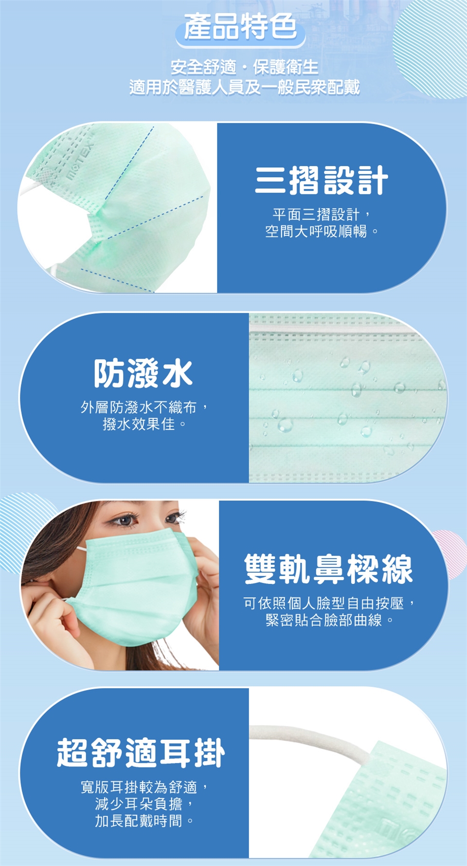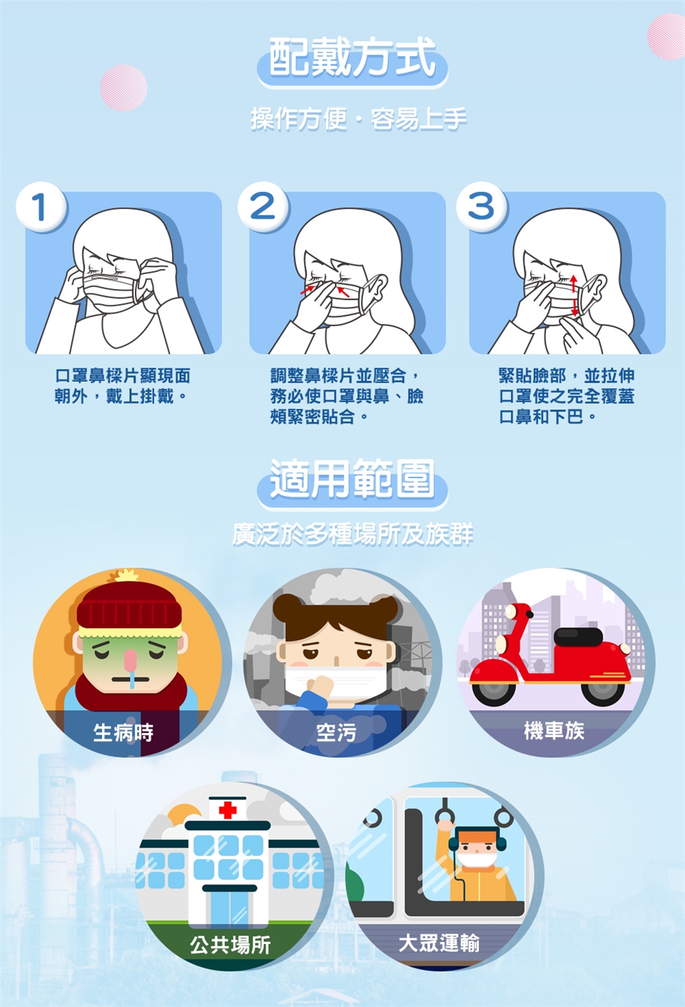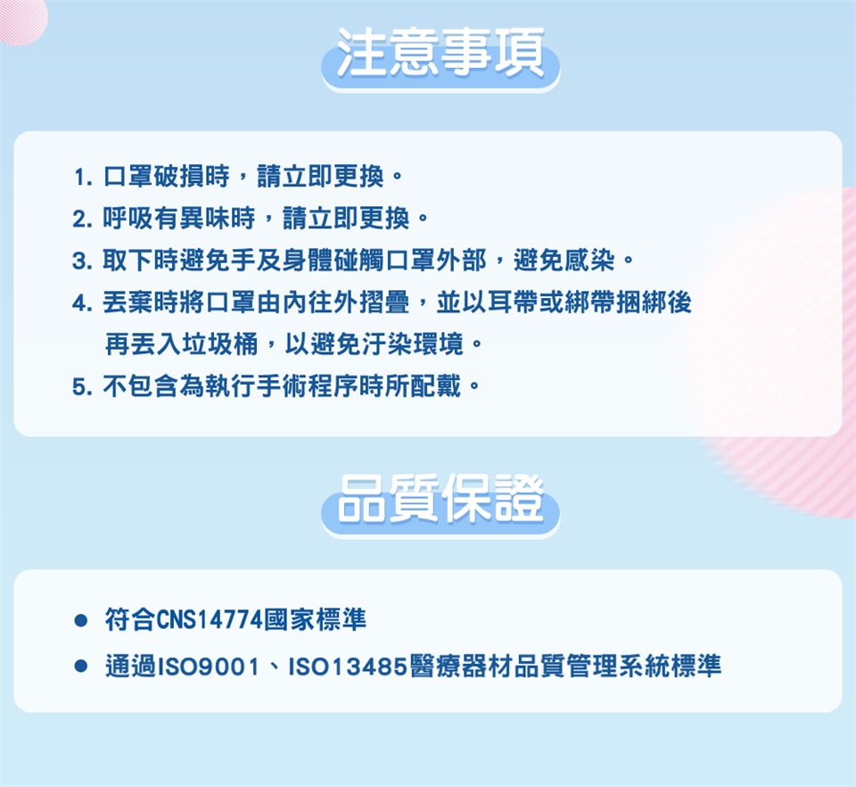 1.呼吸有異味時,請立即更換,取下時避免手及身體碰觸口罩外部,避免汙染。