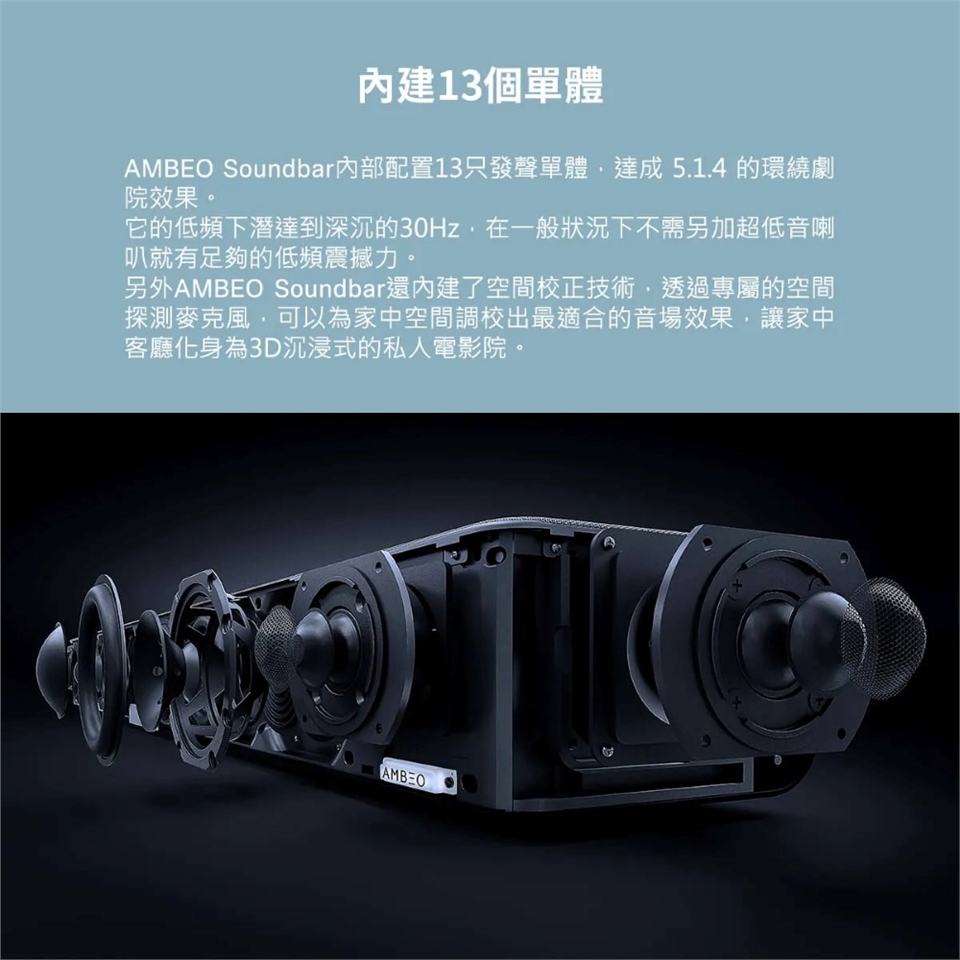 單體:4吋長衝程低音單體 ×6、1吋鋁質球形高音單體 ×5、3.5吋全音域天空聲道單體 ×2 (喇叭單體由內建Class-D擴大機推)