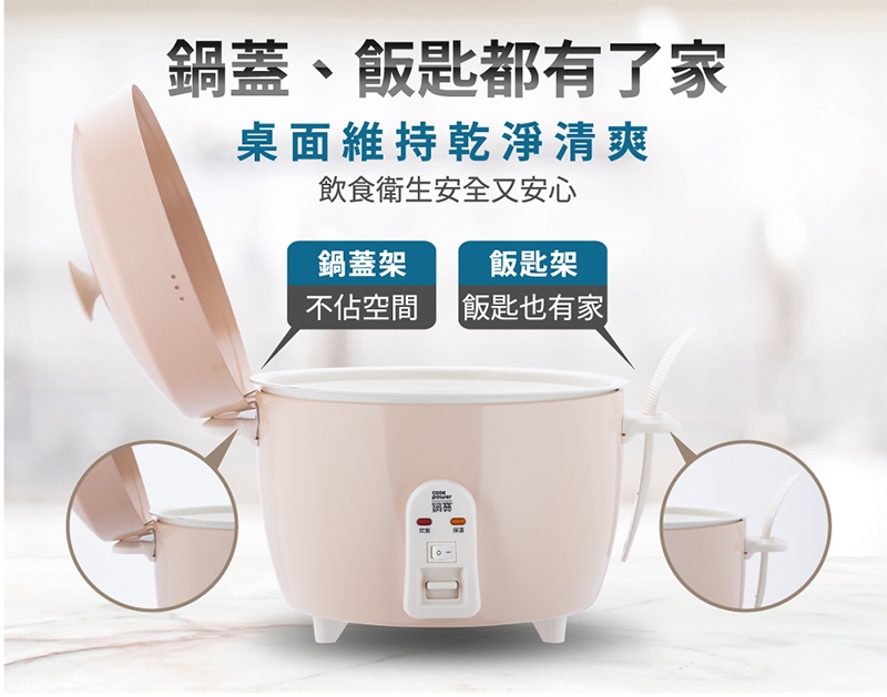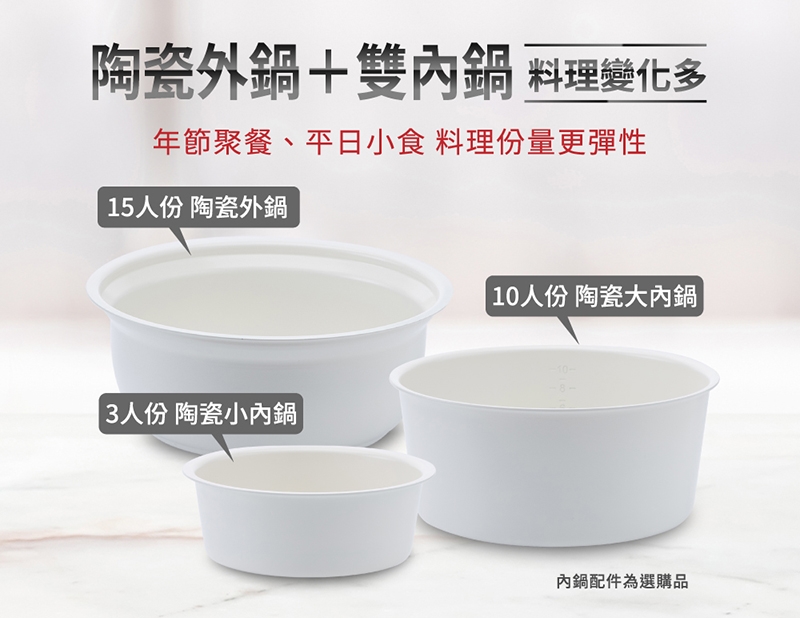 附件:10人外鍋×1、內鍋×1、蒸架×1、飯匙×1、量米杯×1