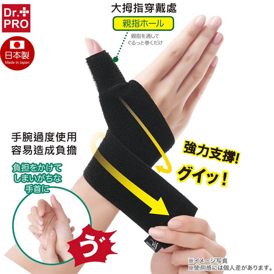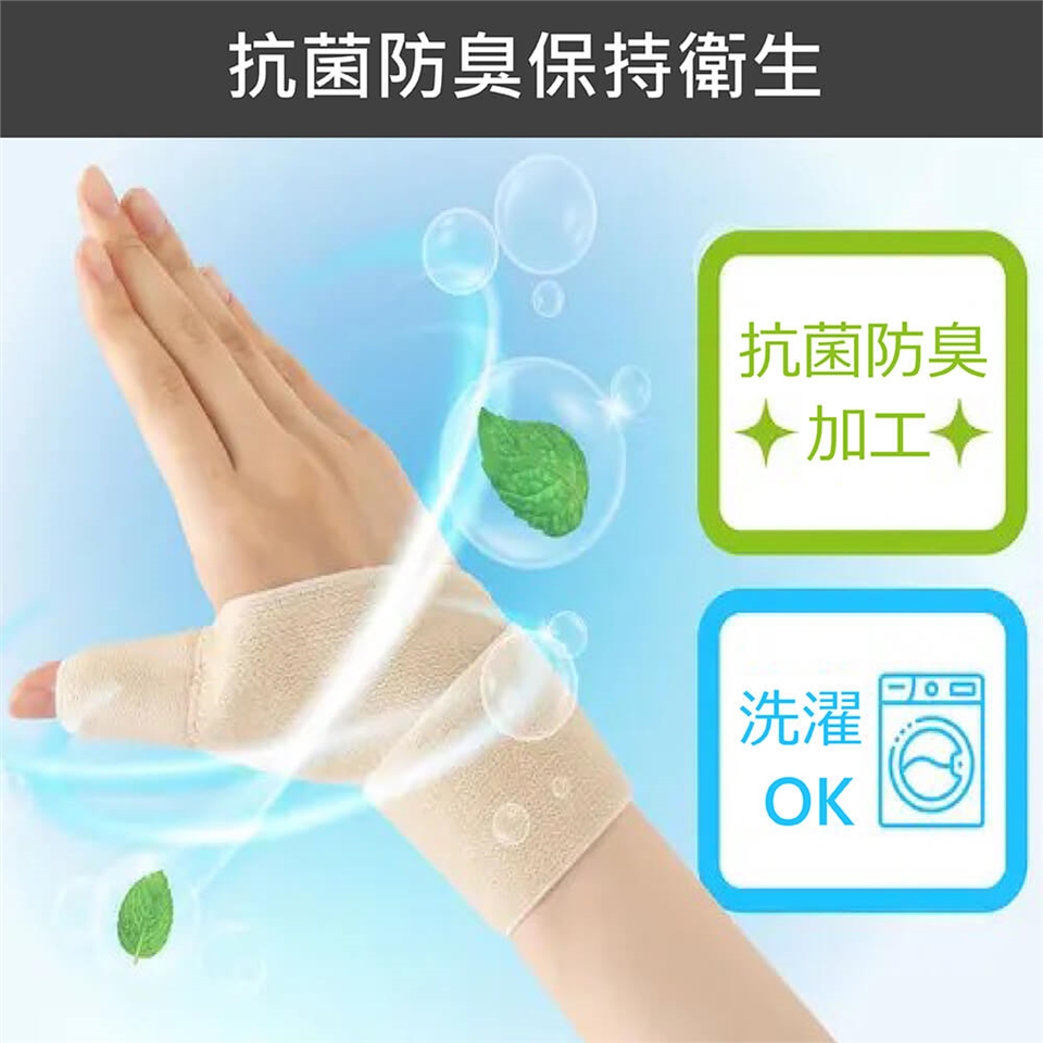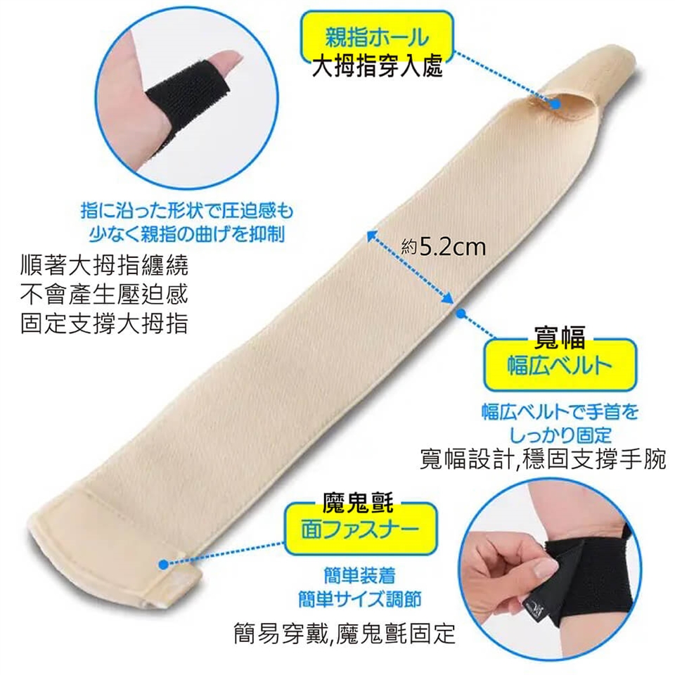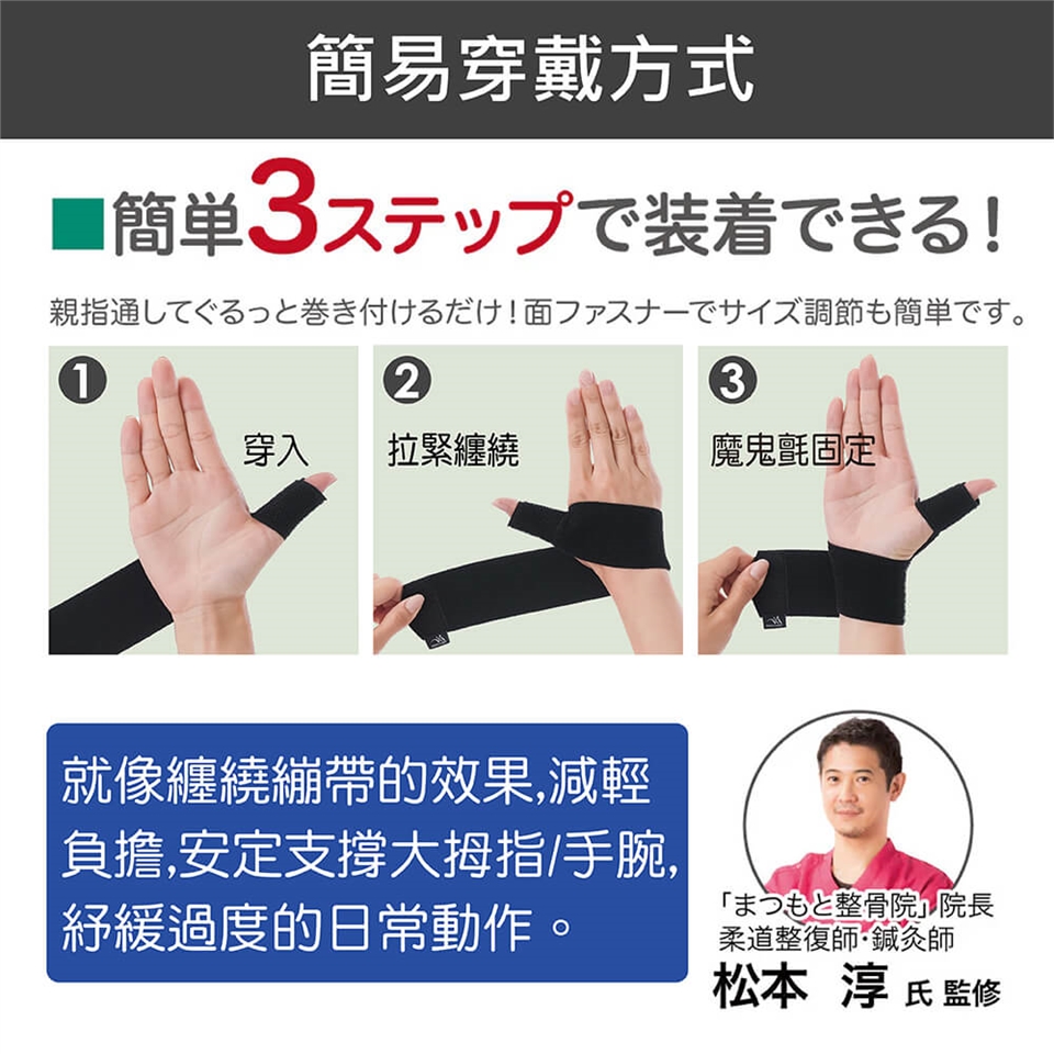 依包裝盒圖示,調整位置後穿入大拇指,拉緊纏繞手背至手腕,魔鬼氈固定黏貼即可