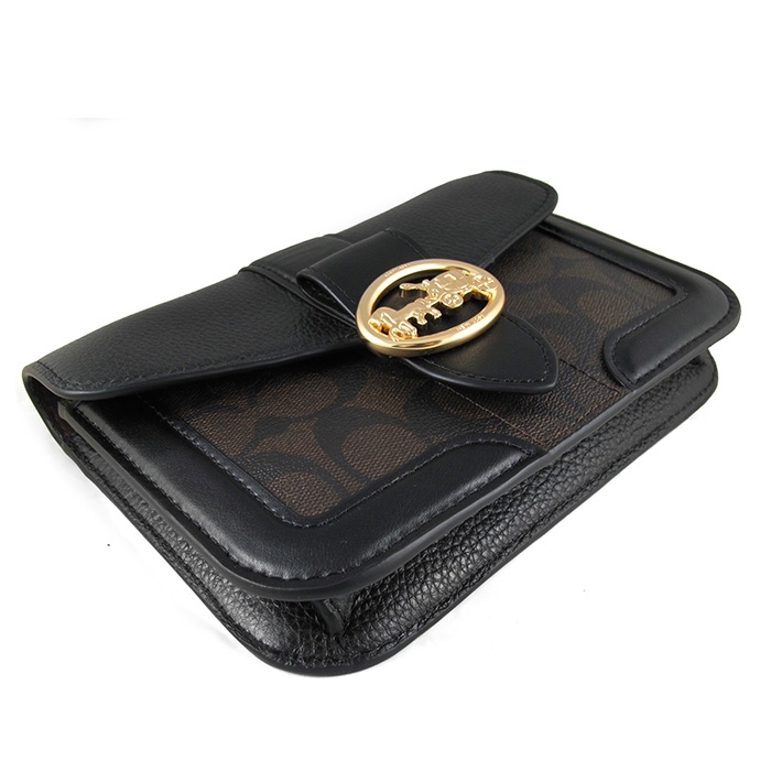 COACH 咖黑色馬車防潑水LOGO掀蓋式鏈帶斜背包。內有一拉鍊袋/3內袋/8個卡片層及一外袋設計,搭配可調整斜背帶,一包在手保證讓您整體造型更加完美。