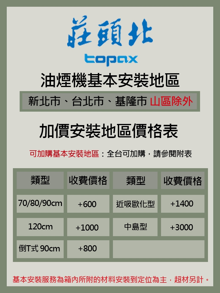 抽油煙機:購買前請先確認--住家安裝位置、尺寸大小、商品顏色,一經安裝恕不退換。