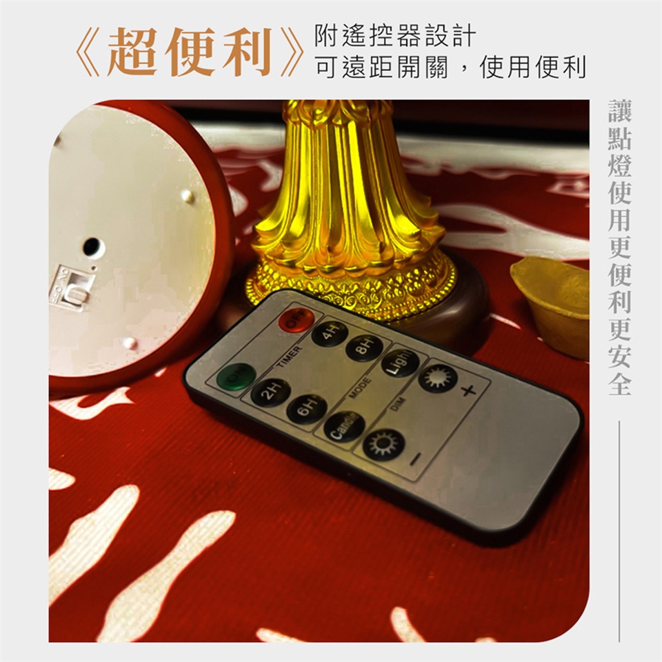 產品配件:斗燭一對、USB一對二圓頭充電線一條、遙控器一個。