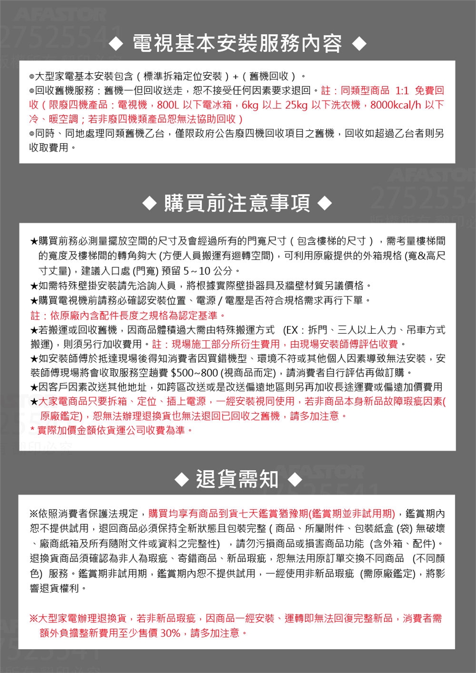 ◎本商品含基本安裝(拆箱定位)+運送到府+舊機回收。