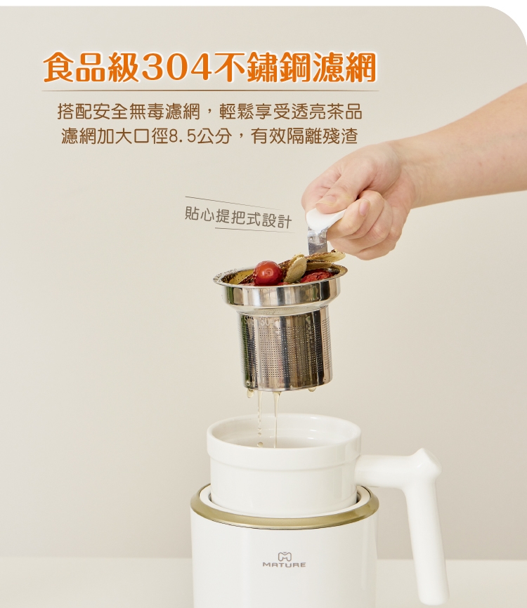 商品材質:杯體含蓋-陶瓷、杯蓋隔熱套-矽膠、機身-PC塑膠、PP塑膠、量杯-PP塑膠、濾網-304不鏽鋼