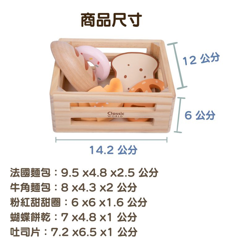 有法國麵包、牛角麵包、粉紅甜甜圈、蝴蝶餅乾、吐司片~