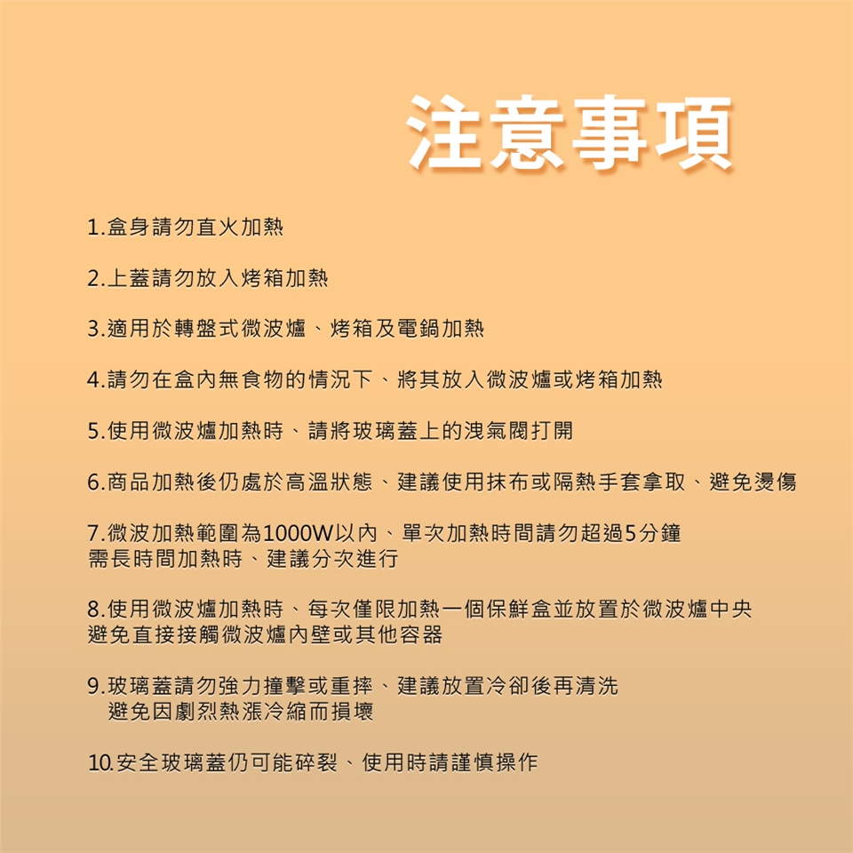 7. 使用微波爐加熱時,每次僅限加熱一個保鮮盒,並放置於微波爐中央,避免直接接觸微波爐內壁或其他容器。