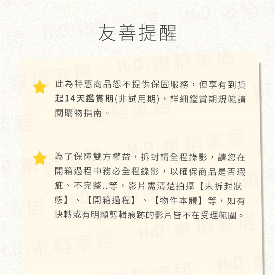 (1) 配送時間:大型家俱配送不易,配送時間約7至14個工作天(不含假日),送貨前物流公司將會與你確認送貨時間,星期日及國定假日皆無配送。