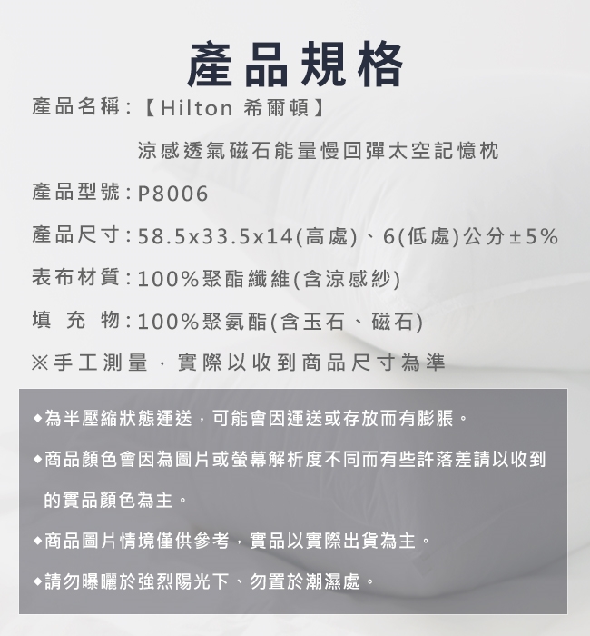 產品名稱:【Hilton 希爾頓】涼感透氣磁石能量慢回彈太空記憶枕