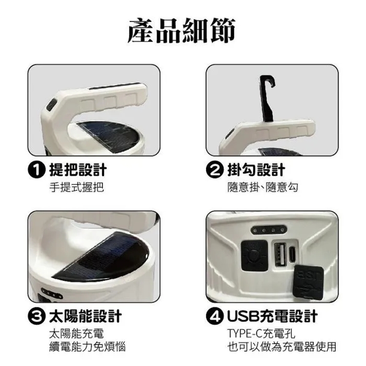 - 燈身可手持、吊掛、站立使用