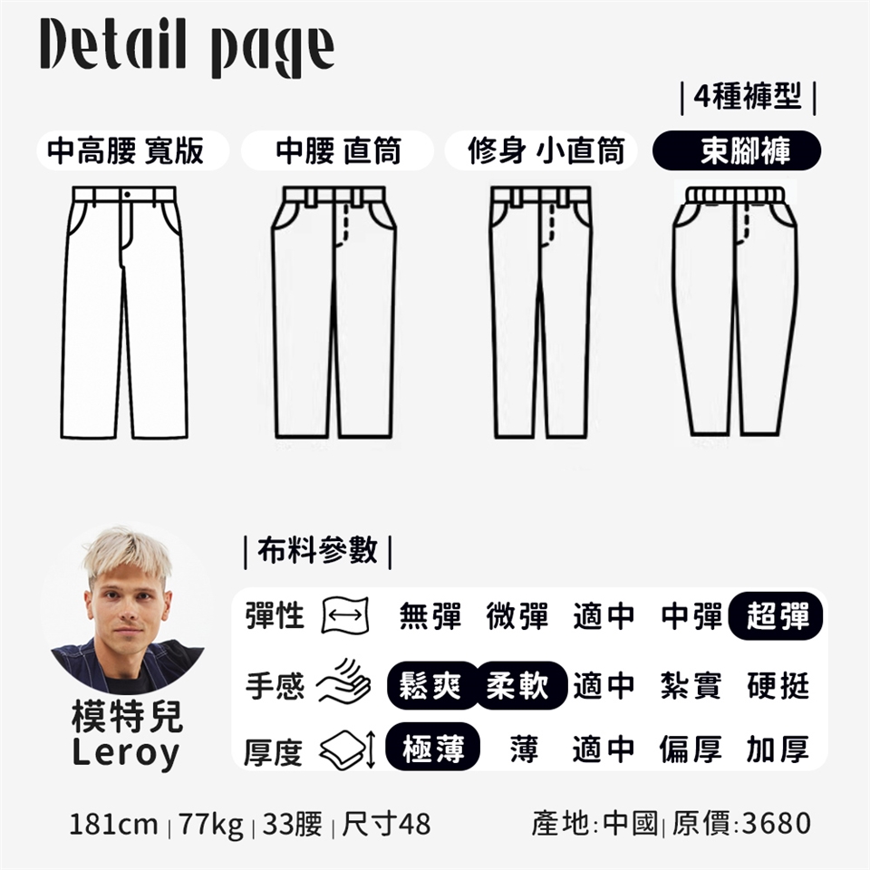 此款為"鬆緊帶褲頭" 尺寸範圍與NST Jeans其他長褲不一樣