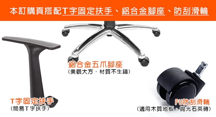 本訂購頁規格:T字固定扶手、鋁合金腳座、PU防刮輪