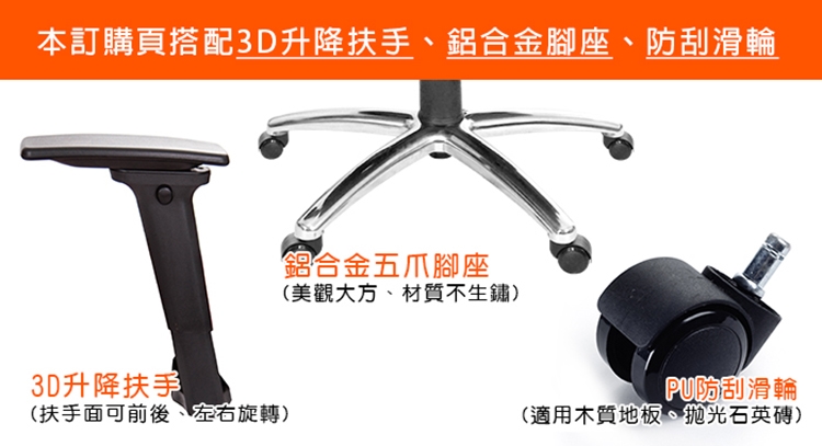 本訂購頁規格:3D升降扶手、鋁合金腳座、PU防刮輪