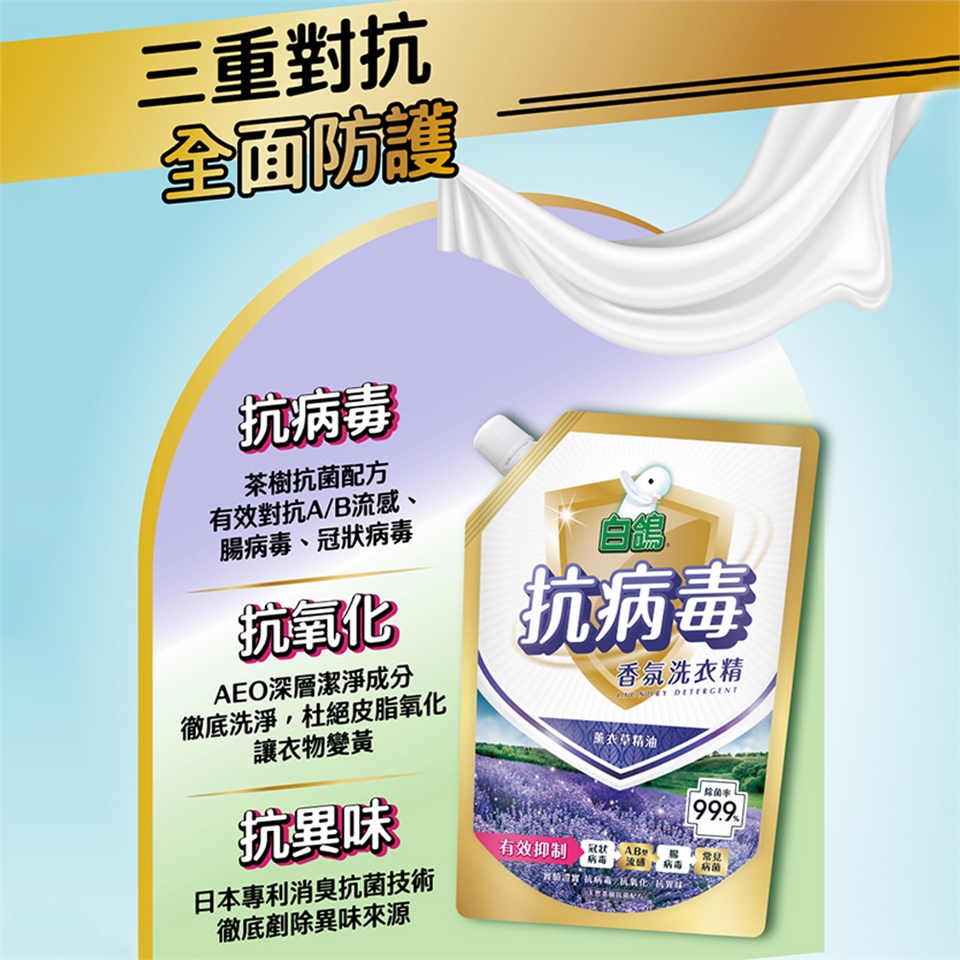 ★抗病毒:茶樹抗菌配方,經國內知名大學病毒實驗室測試,可有效對抗病毒(AB流感、腸病毒、冠狀病毒) (※冠狀病毒是指人類冠狀病毒229E) 經SGS驗證,有效洗淨衣物上常見之多種病菌(金黃色葡萄球菌、大腸桿菌、綠膿桿菌、白色念珠菌)