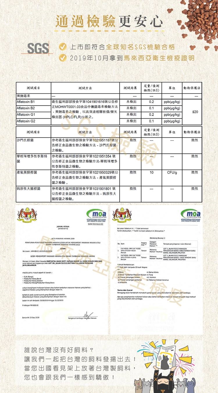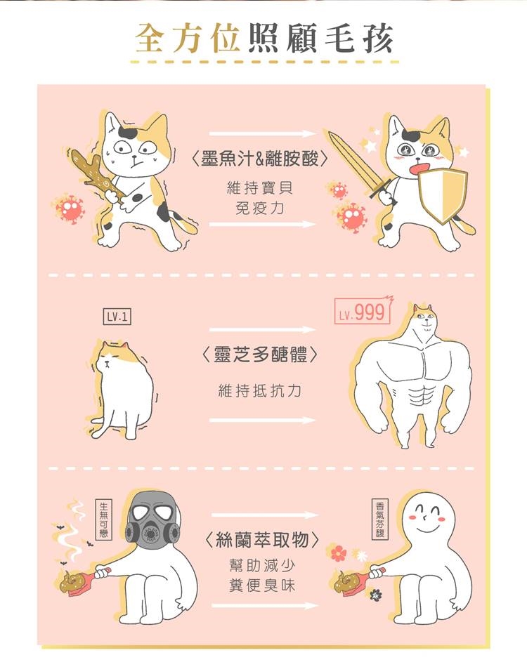 蛋白質42%↑、脂肪16%↑、纖維5%↓、水分10%↓、鈣1.1%↑、磷1%↑、灰分9%↓、牛磺酸0.15%↑
