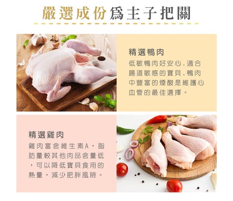雞肉、鴨肉、木薯、豌豆、鮭魚油(DHA/EPA)、雞油、甜菜纖維、水解雞肝、新鮮雞蛋、礦物質與螯合礦物(磷酸二鈣、氯化鉀、氯化鈉、硫酸亞鐵、氧化鋅、硫酸銅、硫酸錳、碘化鈣、螯合鐵、螯合銅、螯合鋅、酵母硒) 、海藻粉、酵母粉、DL-蛋氨酸、離胺酸、亞麻籽、綜合維生素(氯化膽鹼、維生素A、維生素E、維生素C、維生素D3、維生素B1、菸鹼酸、泛酸鈣、維生素B6、核黃素、葉酸、維生素H2、維生素B12)、牛磺酸、絲蘭萃取物、蔓越莓、果寡糖、葡萄糖胺、B-胡蘿蔔素、嗜酸乳球菌發酵物、枯草芽袍桿菌發酵物、乳酸菌、木瓜酵素、靈芝多醣體、墨魚汁、生育酚保存。