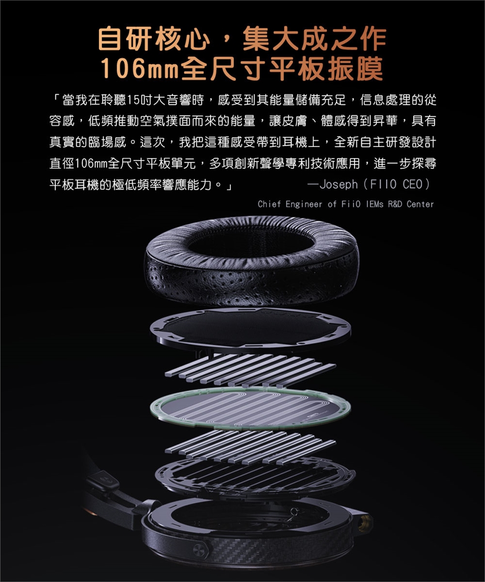 「當我在聆聽15吋大音響時,感受到其能量儲備充足,信息處理的從容感,低頻推動空氣撲面而來的能量,讓皮膚、體感得到昇華,具有真實的臨場感。這次,我把這種感受帶到耳機上,全新自主研發設計直徑106mm全尺寸平板單元,多項創新聲學專利技術應用,進一步探尋平板耳機的極低頻率響應能力。」—JOSEPH(FIIO CEO)