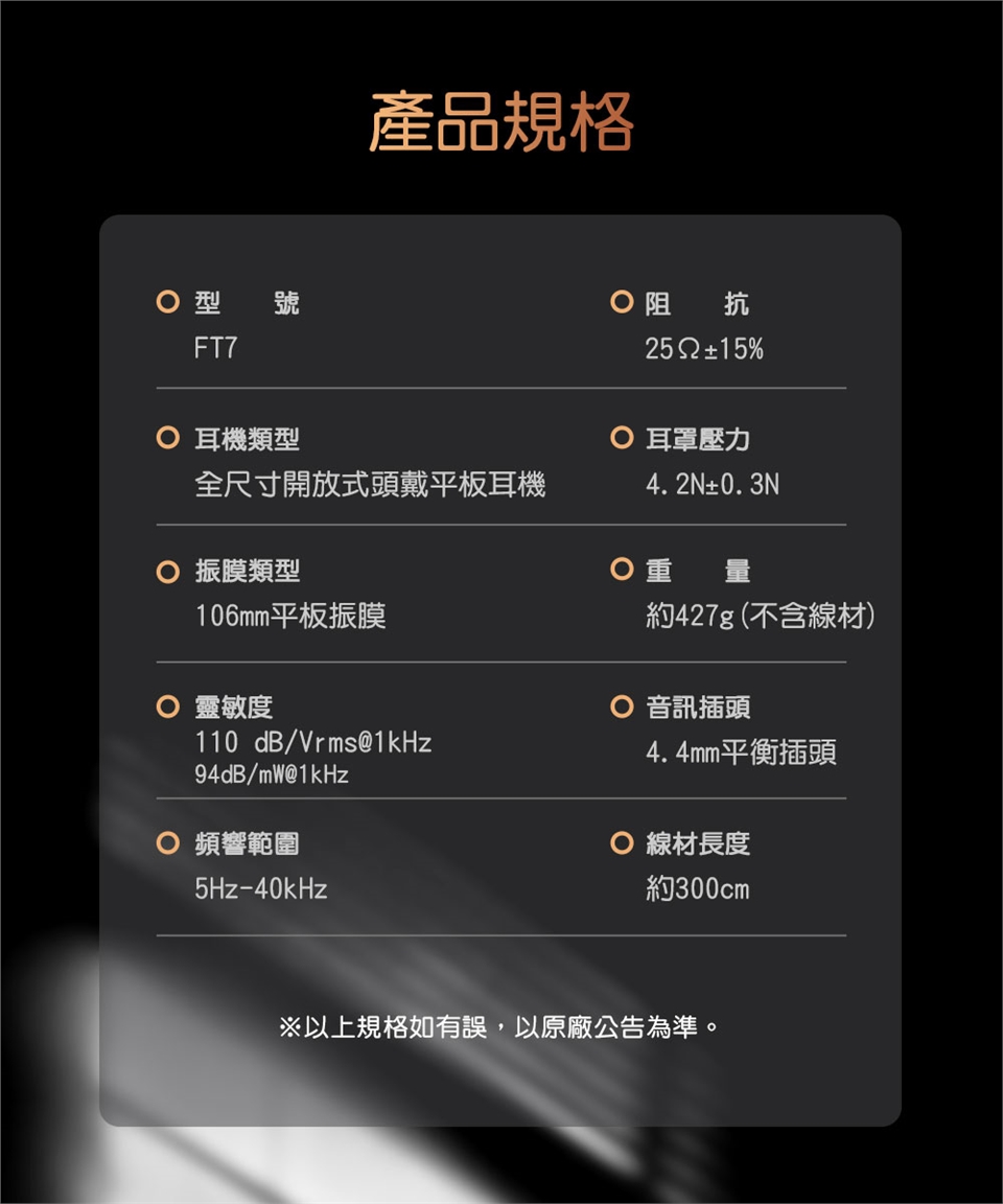 注意事項:本產品僅包含FT7*1、耳機線*1、XLR-4公轉4.4mm母平衡轉接頭*1、小羊皮耳罩*1組(出廠時安裝在耳機上)、透氣織布耳罩*1組、訂製耳機收納包*1、說明書*1,電腦、播放器、手機…等為示意圖。