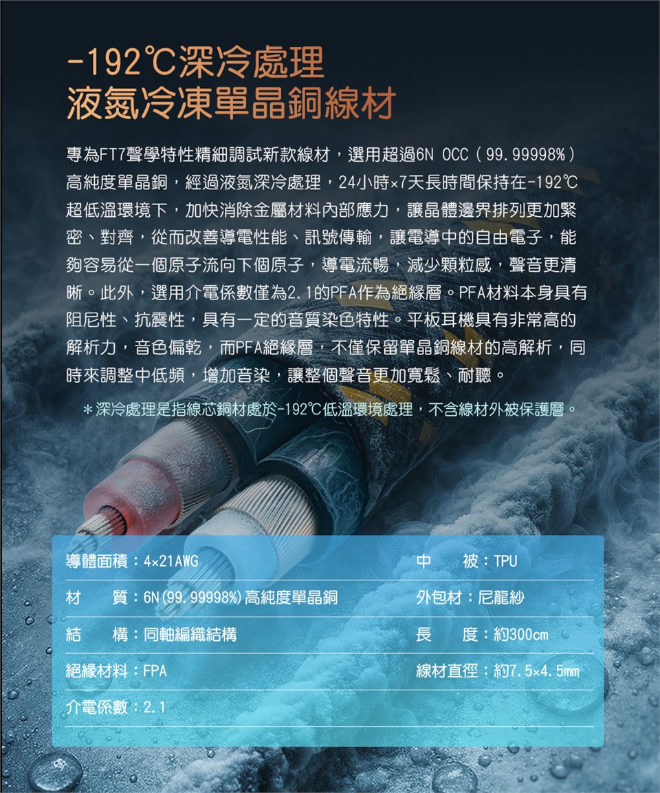 專為FT7聲學特性精細調試新款線材,選用超過6N OCC(99.99998%)高純度單晶銅,經過液氮深冷處理,24小時×7天長時間保持在-192℃超低溫環境下,加快消除金屬材料內部應力,讓晶體邊界排列更加緊密、對齊,從而改善導電性能、訊號傳輸,讓電導中的自由電子,能夠容易從一個原子流向下個原子,導電流暢,減少顆粒感,聲音更清晰。此外,選用介電係數僅為2.1的PFA作為絕緣層。PFA材料本身具有阻尼性、抗震性,具有一定的音質染色特性。平板耳機具有非常高的解析力,音色偏乾,而PFA絕緣層,不僅保留單晶銅線材的高解析,同時來調整中低頻,增加音染,讓整個聲音更加寬鬆、耐聽。