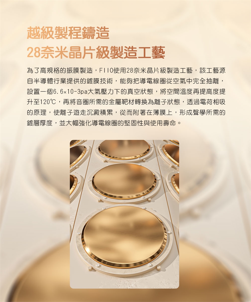 為了高規格的振膜製造,FIIO使用28奈米晶片級製造工藝,該工藝源自半導體行業提供的鍍膜技術,能夠把導電線圈從空氣中完全抽離,設置一個6.6×10-3pa大氣壓力下的真空狀態,將空間溫度再提高度提升至120℃,再將音圈所需的金屬靶材轉換為離子狀態,透過電荷相吸的原理,使離子遊走沉澱積累,從而附著在薄膜上,形成聲學所需的鍍層厚度,並大幅強化導電線圈的堅固性與使用壽命。