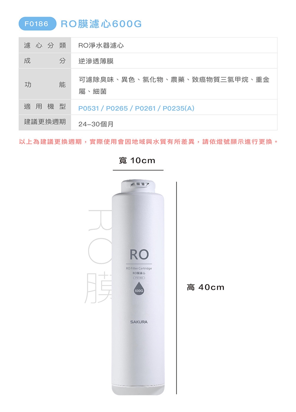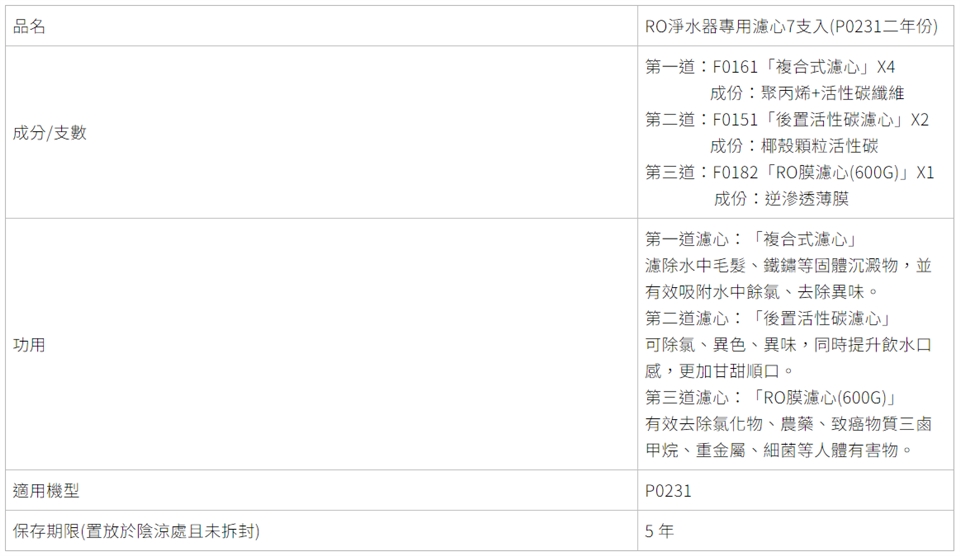 成份:椰殼顆粒活性碳第三道:F0186「RO膜濾心(600G)」X1