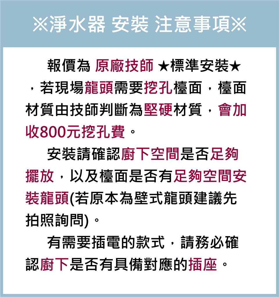 ★北北基以外地區安裝(原廠北北基不含鶯歌、林口、三峽等地區),現場技師到府安裝會酌收 標準安裝費 ★ 詳見下單注意事項