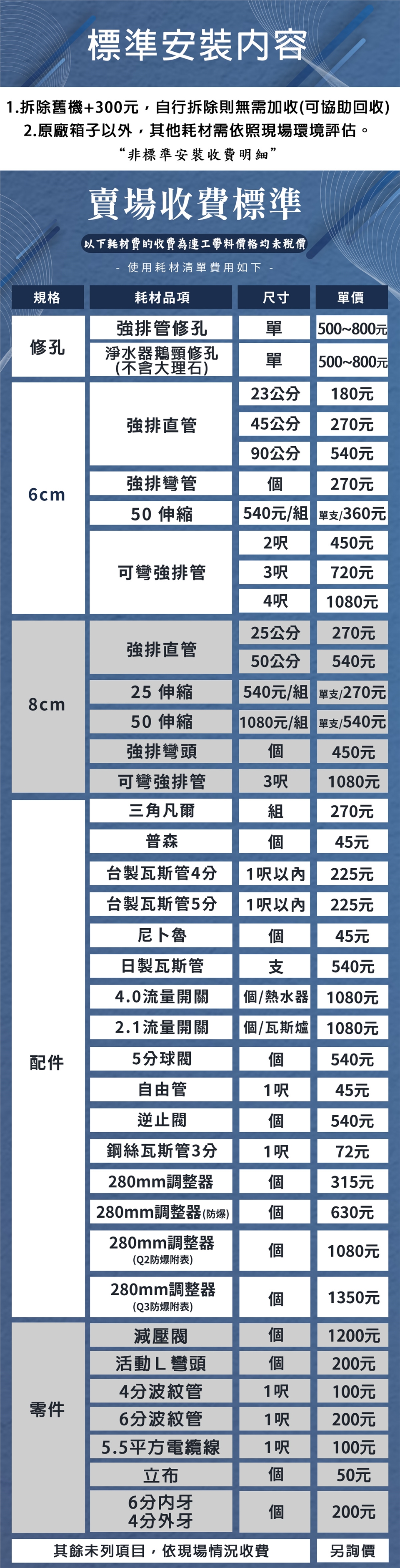 ※本報價採用【標準安裝】定義為原廠箱子內隨貨配件為基準(其餘所需材料以下表收費為準)