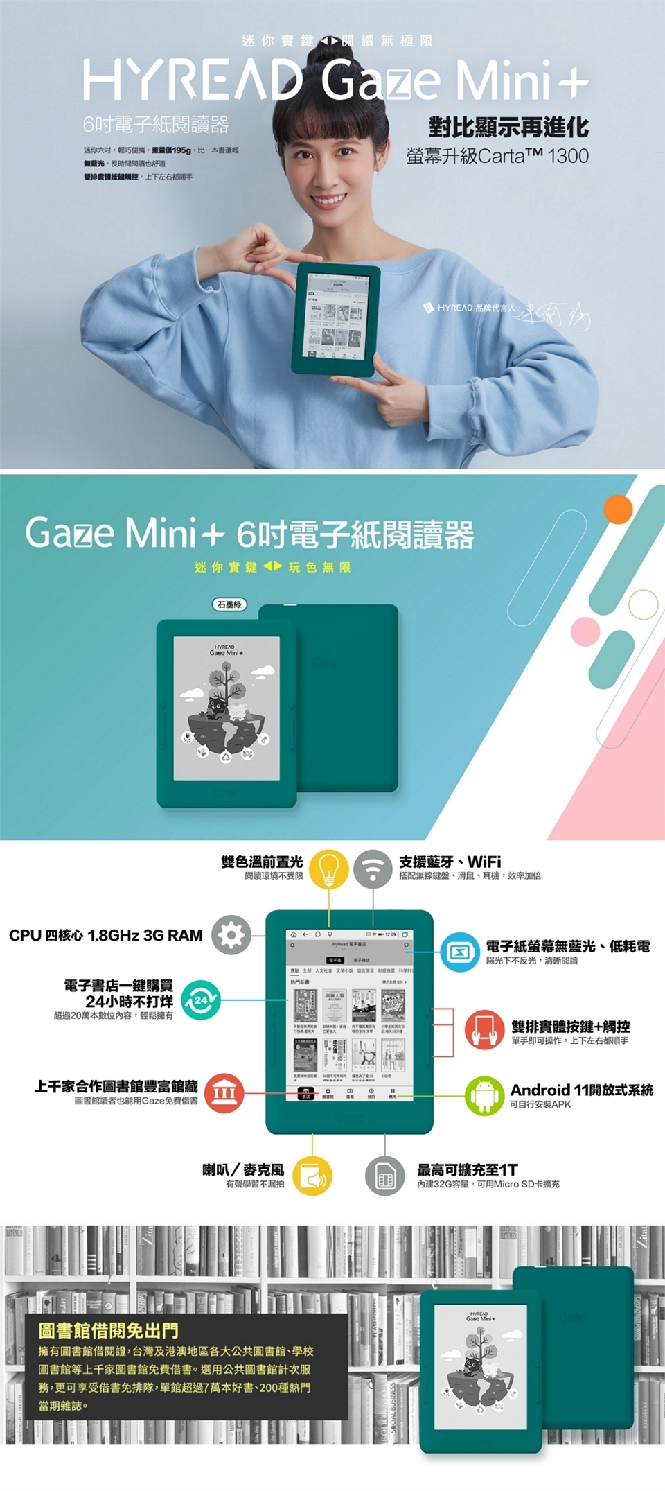 | (1) 購買一台HyRead Gaze Mini+ 6吋主機,可獲贈紅利點【288點】。(包含經典白/淺蔥青/石墨綠/櫻花粉) | |