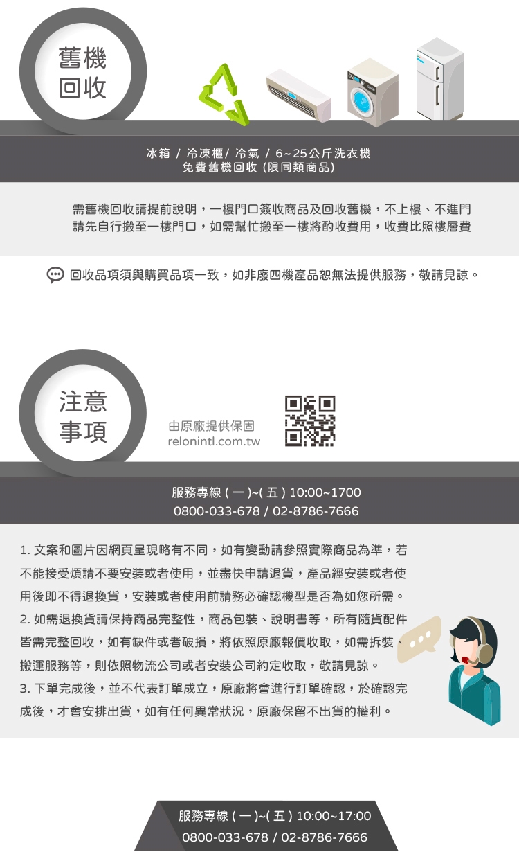 5.購買前須確認環境(空間/排水),如因環境因素產品無法安裝,仍會收取跨區費及樓層費,且將酌收單趟$500物流空趟費。