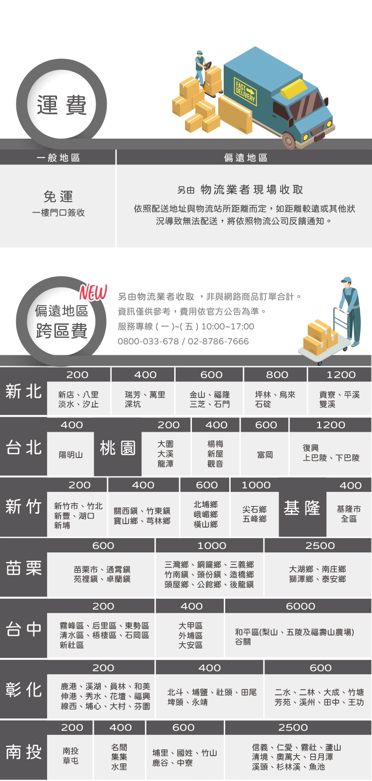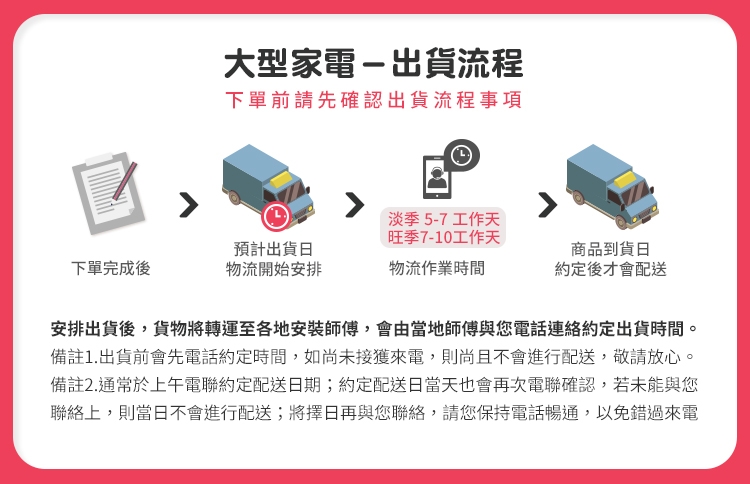 4.如非產品瑕疵等因素辦理退貨,貨運回收退貨時,如收退貨地址牽涉跨區及樓層費用,將會【再次】收取跨區費及樓層費。