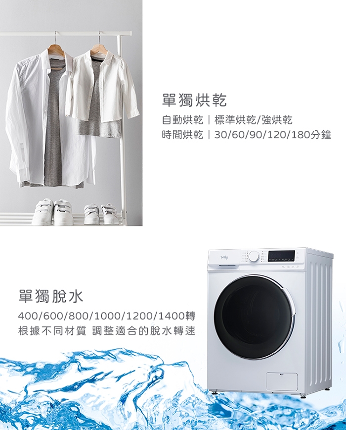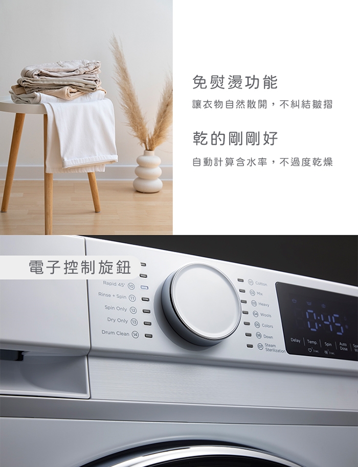 內建排水馬達,脫水及烘衣時,馬達都會進行排水動作。(排水方式不受限,擺放位置選擇更多元)