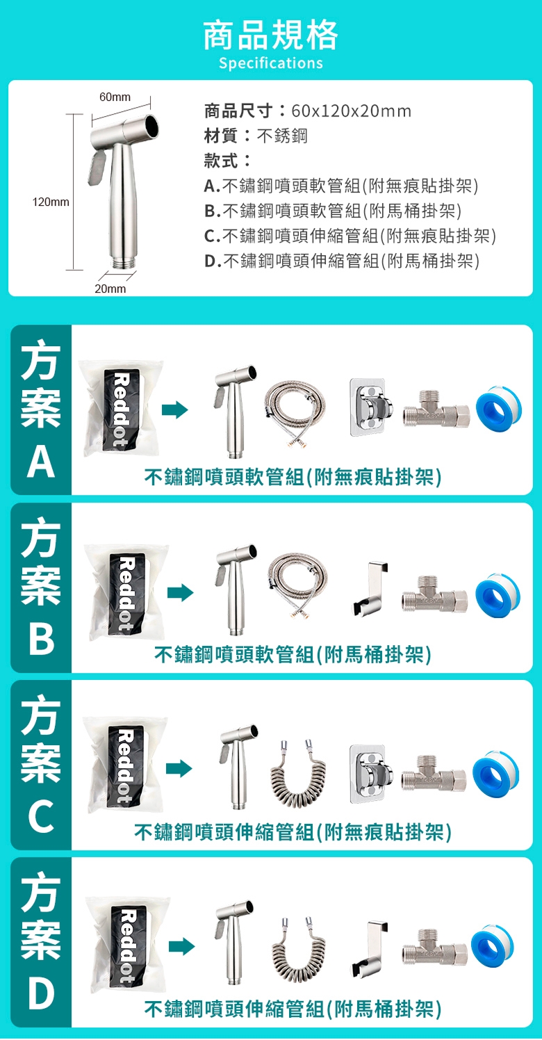 款式:A.不鏽鋼噴頭軟管組(附無痕貼掛架)/B.不鏽鋼噴頭軟管組(附馬桶掛架)/C.不鏽鋼噴頭伸縮管組(附無痕貼掛架)/D.不鏽鋼噴頭伸縮管組(附馬桶掛架)