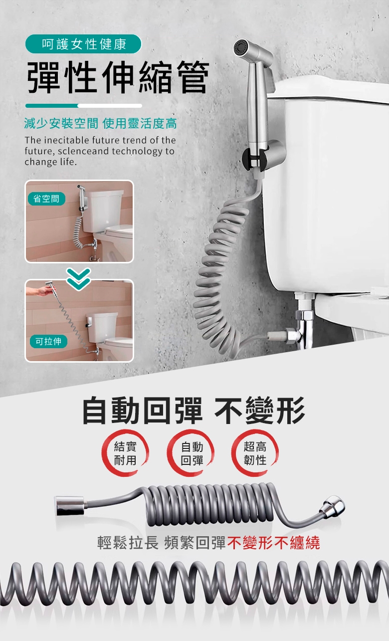 D不鏽鋼噴頭伸縮管組(附馬桶掛架)-內含:噴槍主體x1/1.5m伸縮管x1/馬桶掛架x1/三通轉接頭x1/止洩帶x1