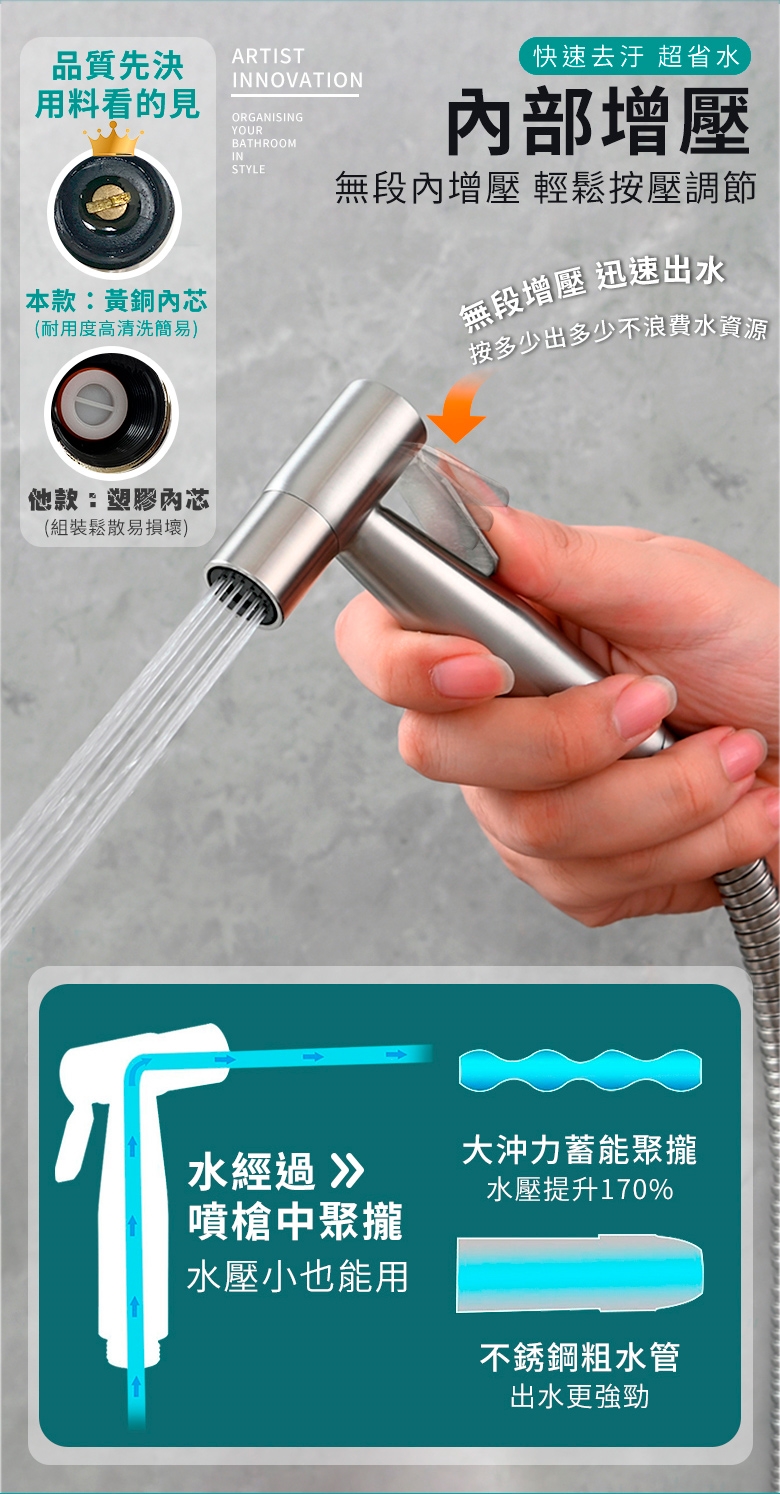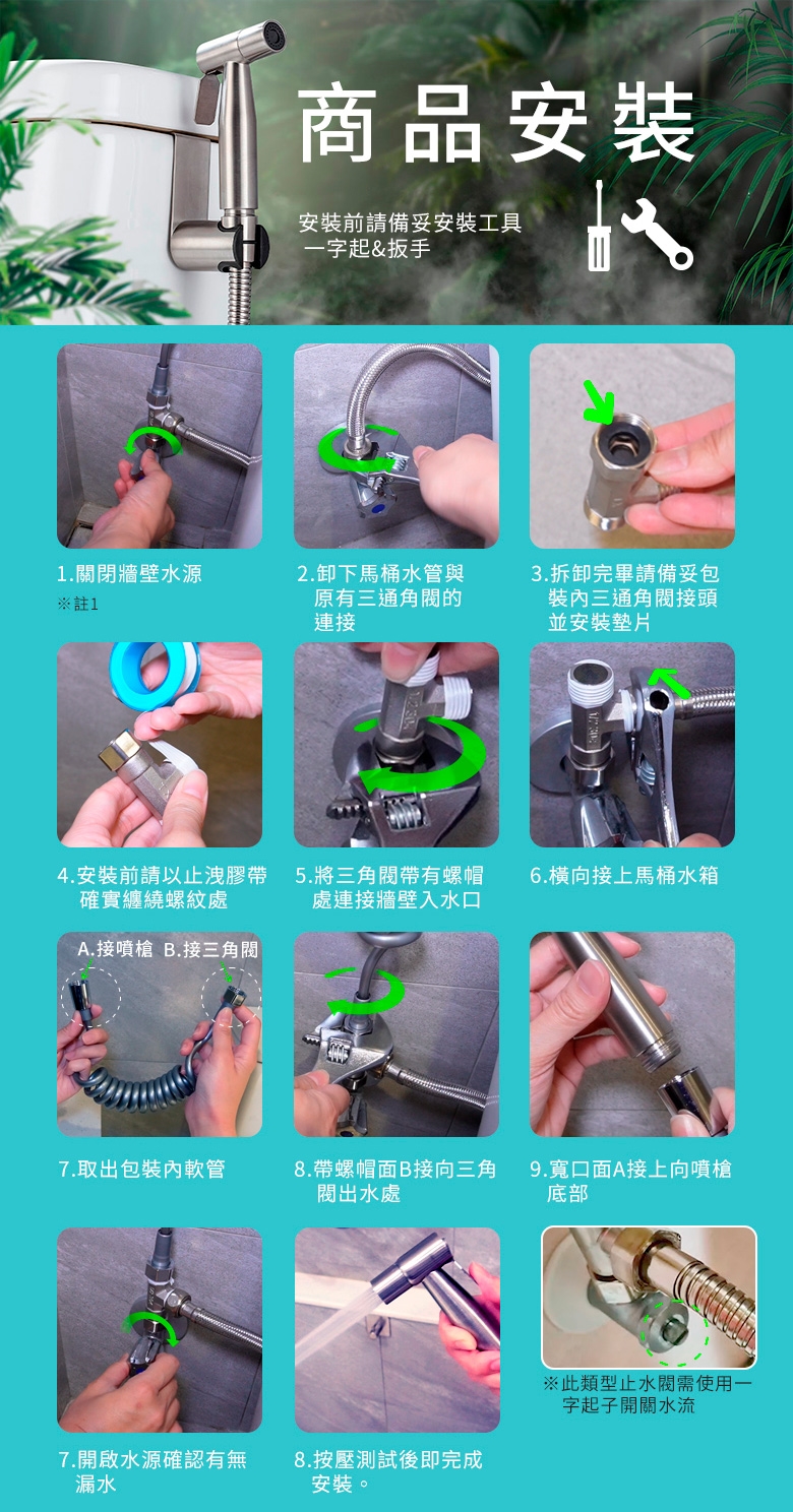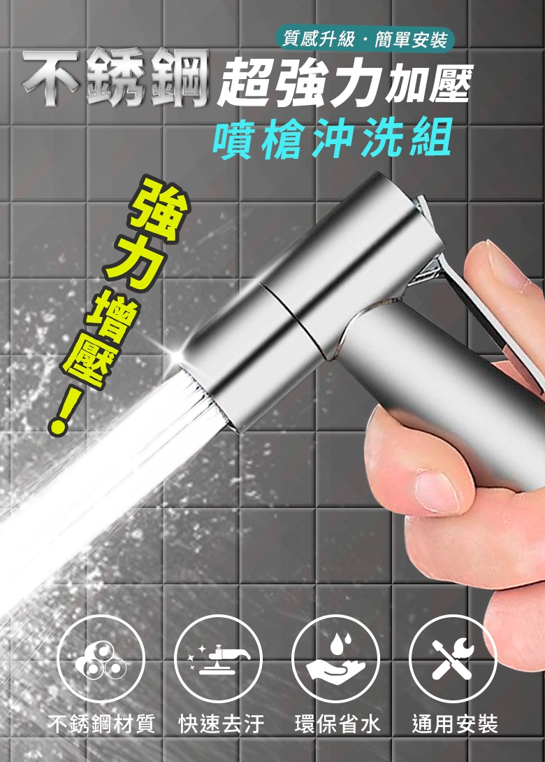 材質/成份:噴槍主體:不鏽鋼/1.5m軟管:不鏽鋼/無痕貼掛架:ABS/三通轉接頭:不鏽鋼/1.5m伸縮管:PVC/馬桶掛架:不鏽鋼/止洩帶:PTFE